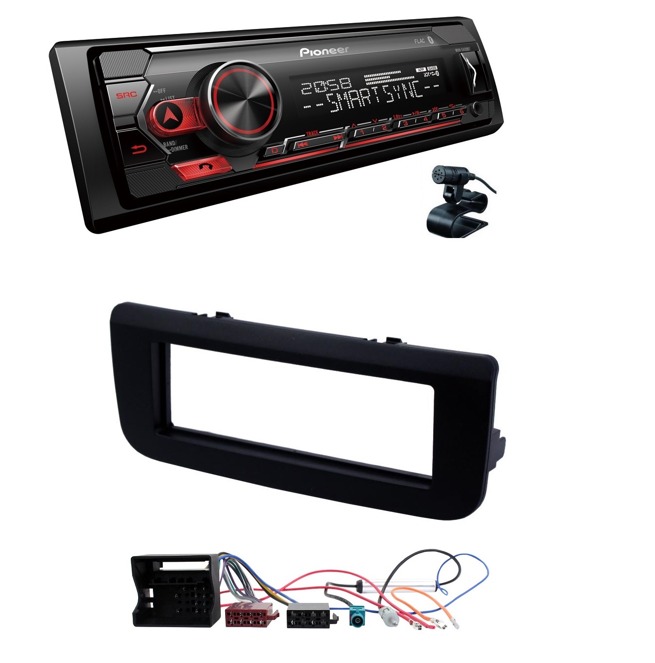 Приемник 1 DIN с модулем Bluetooth, красной подсветкой, разъемом USB, поддержкой Spotify и приложением Pioneer Smart Sync, совместимым с устройствами Apple и Android.