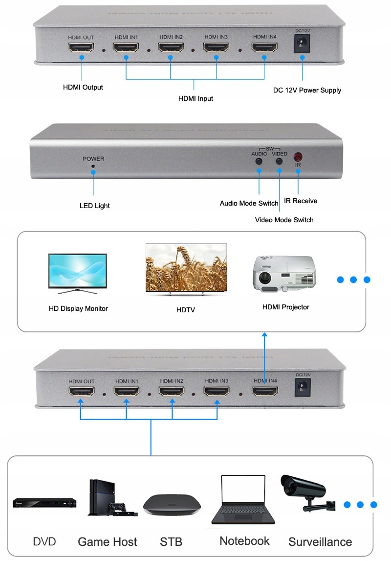 Устройство Multi-Viewer позволяет отображать изображения с четырех источников HDMI с разрешением до 1080P/60 Гц на одном экране. Изображение без потерь, четкое и имеет глубокие цвета. Как устройство Multi-Viewer, оно позволяет отображать изображение в пяти конфигурациях.