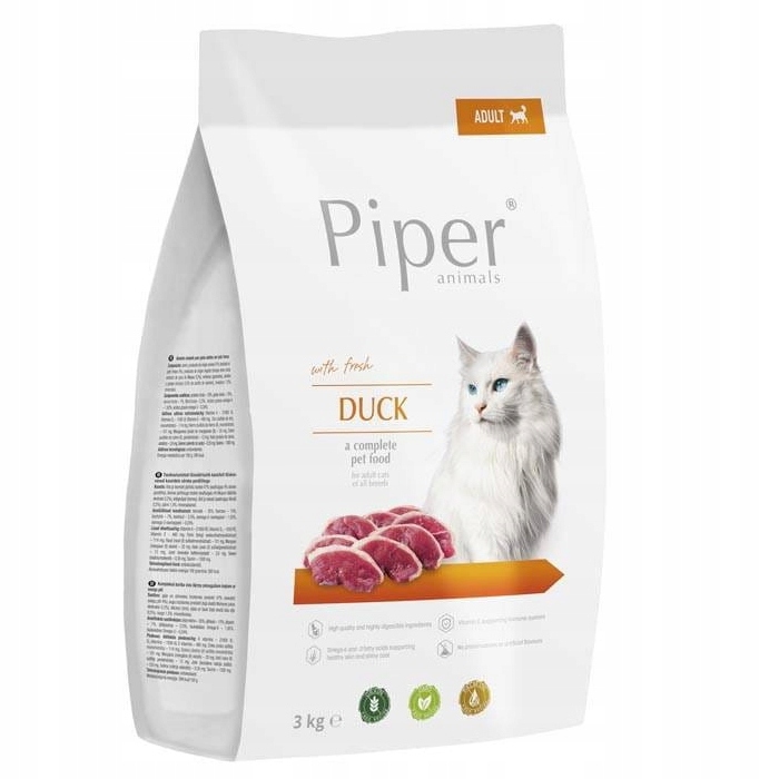 Dry Piper Animals Food с уткой полностью соответствует требованиям питания взрослой кошки. Его сбалансированный состав означает, что его можно использовать в качестве единственной пищи в своем ежедневном рационе, без необходимости в добавлении и добавлении других продуктов. Источником высококачественного белка и жира являются мясо и продукты животного происхождения, в том числе утка. Жир птицы, как один из немногих, является источником полиненасыщенных жирных кислот из семейства N-6, регулирующих, среди других работа сердца и нервной системы. Юкка Мохаве и сапонины, содержащиеся в нем, обеспечивают правильное функционирование пищеварительного тракта, стимулируя секрецию пищеварительных соков. Dry Piper Animals Food со свежей уткой покрывает спрос на таурин, необходимый для кошки, который соответствует, среди прочего. Для задержки процесса старения тела. (В этом экстракте от Yukka Mojave 0,2%), овощи (горох), масла и жиры (включая 0,5%лососевого масла), дрожжи 1,5%, минеральные вещества. >