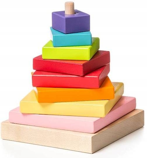 Деревянная развивающая пирамидка — отличная игрушка для детей, состоящая из основания и 8 разноцветных кубиков. Каждый из блоков имеет разный цвет и размер, и чтобы создать из них пирамиду, нужно расположить одно кольцо поверх другого.
