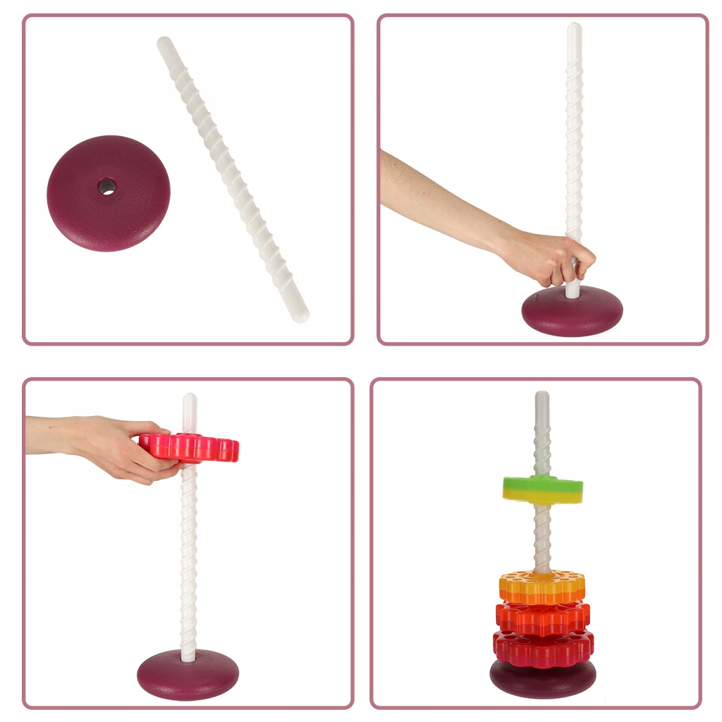 Красочная башня состоит из восьми кругов разного цвета и различной резьбы. Задача малыша — разместить все кружочки на пластиковом стержне, который тоже имеет интересную текстуру!