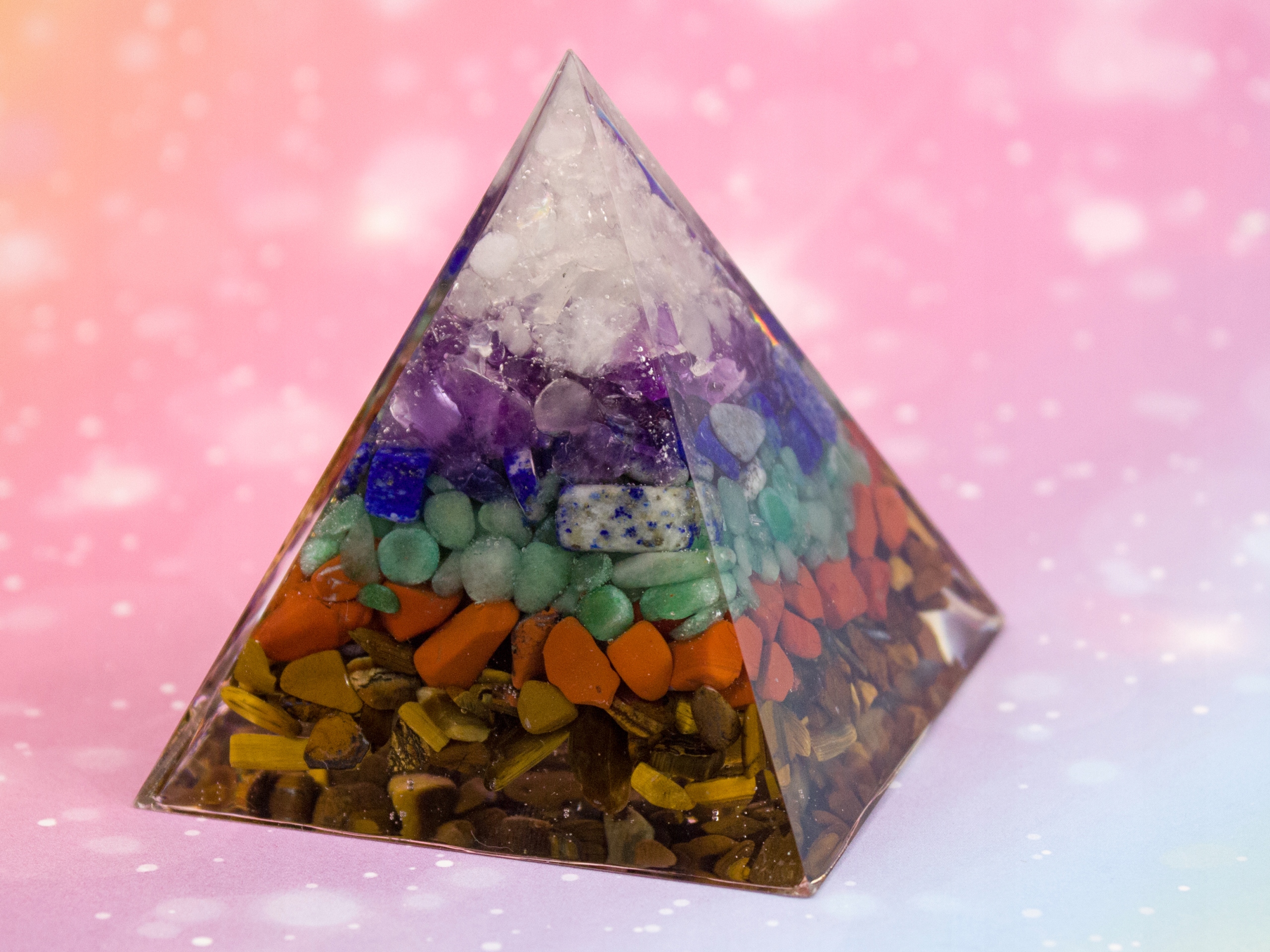 Эта пирамида оказывает благотворное воздействие на каждую из семи чакр, а благодаря камням и минералам, которые не только красиво выглядят, но и обладают собственной силой, энергией и целительством, усиливают ценный эффект очищения и разблокировки чакр, приносящий добро, счастье, здоровье.