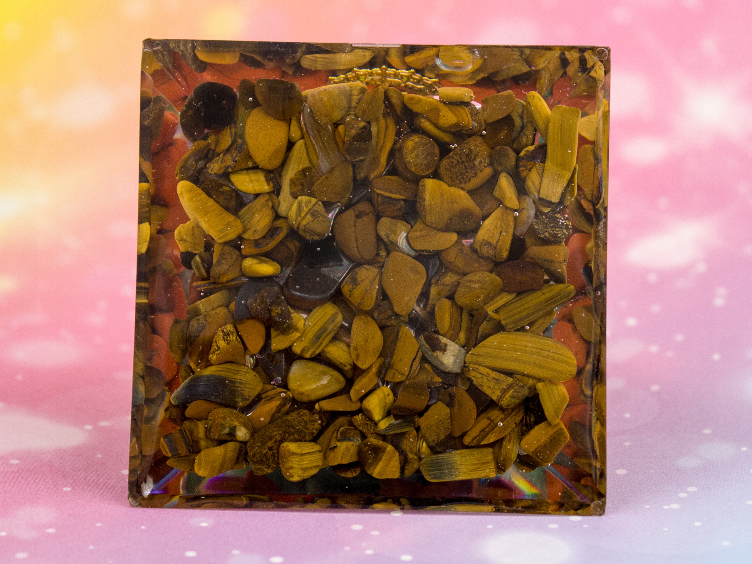 Красивая оргонитовая пирамидка с разноцветными минералами Тигровый глаз, Агат, Зеленый авантюрин, лазурит, аметист и белый кристалл излучают энергию, дарующую хорошее здоровье и способствующую успеху, нейтрализующую плохую энергию, очищающую окружающую среду, добавляющую энтузиазма и творчества.