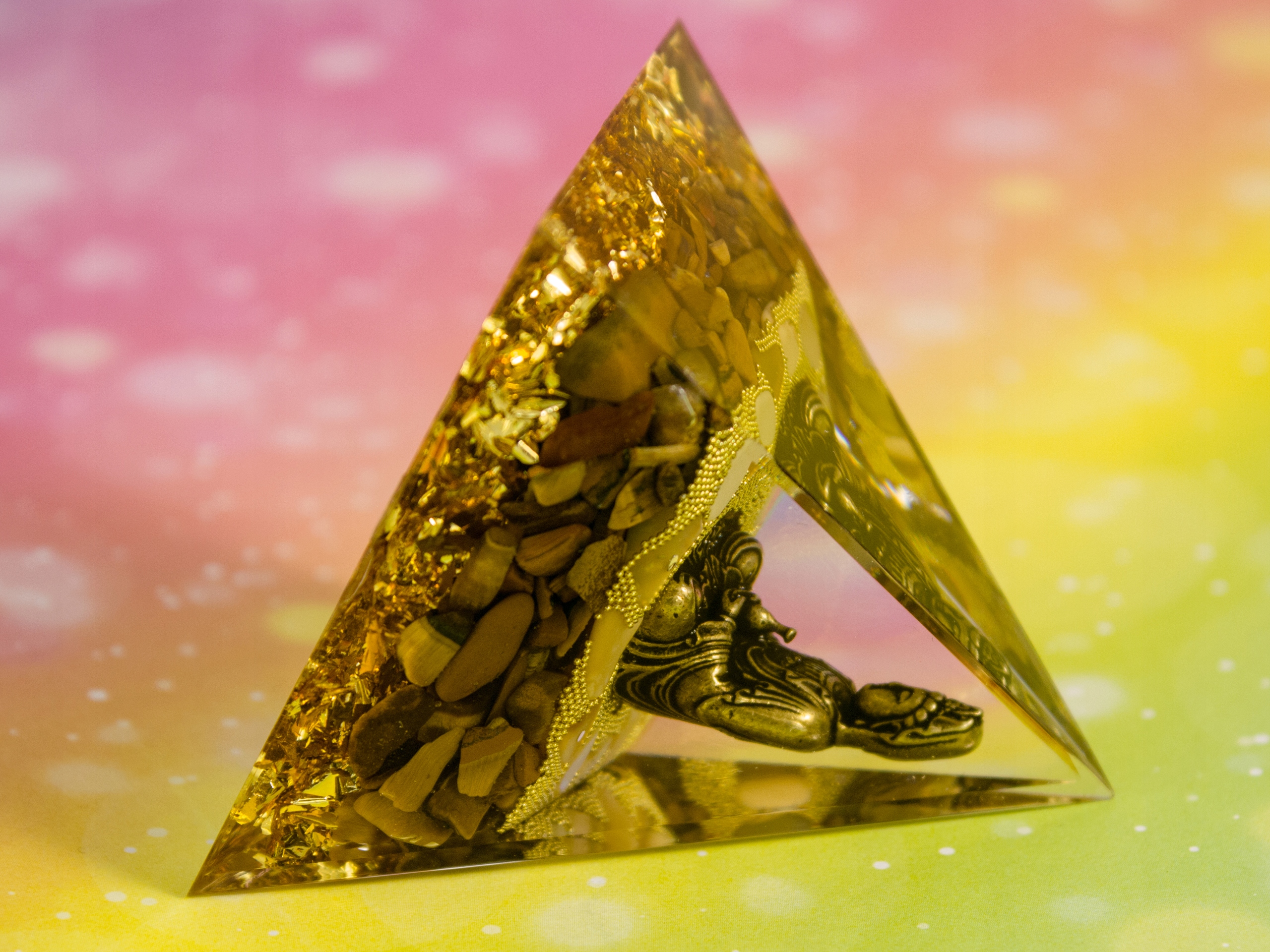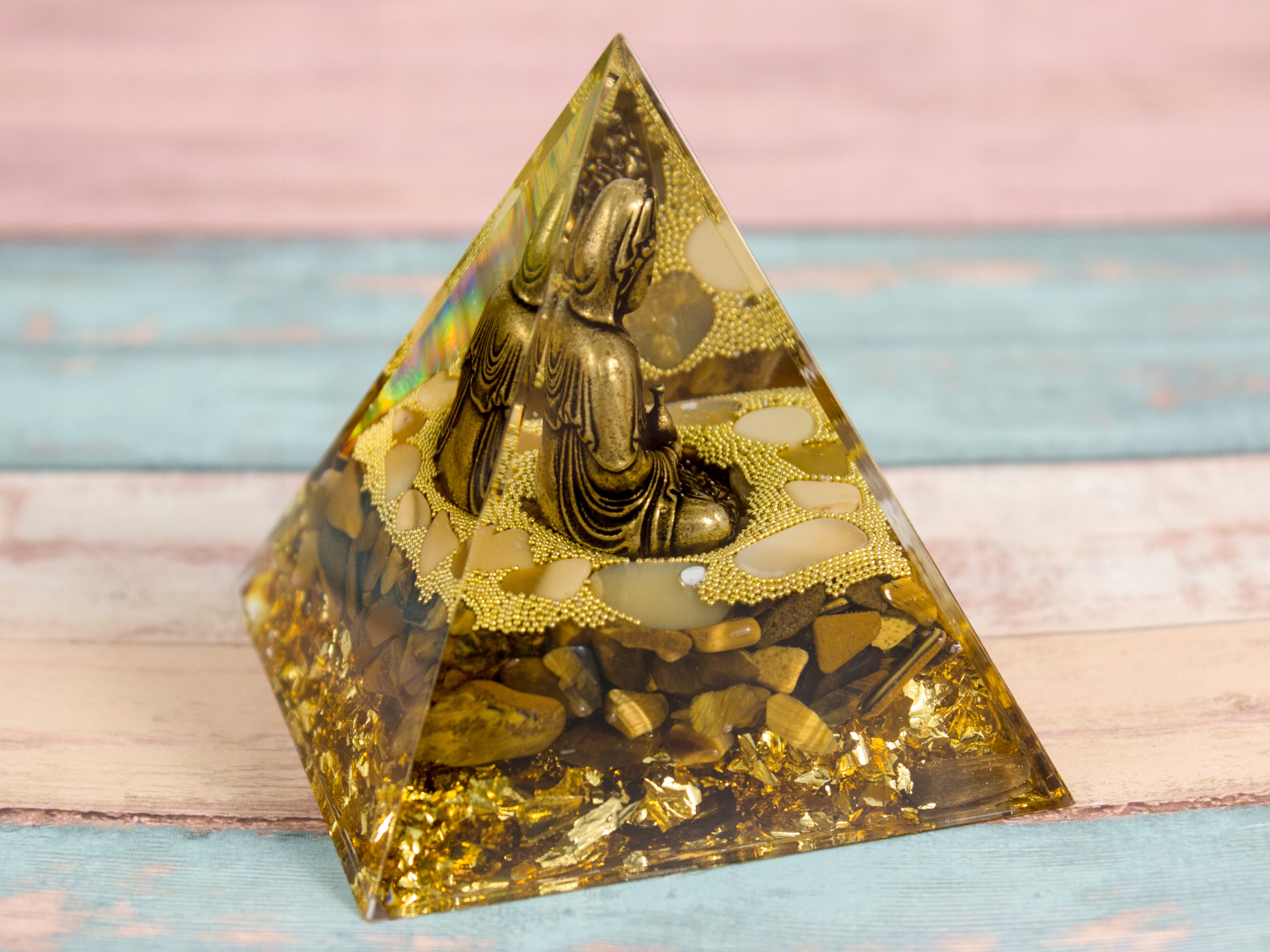 Оргонит пирамида с Тигровым глазом и топазом, над которой находится фигурка Будды, красивое украшение с золотыми кусочками фольги, добавляющее энергии и защиты всему телу, а также мудрости, изобилия и покоя.
