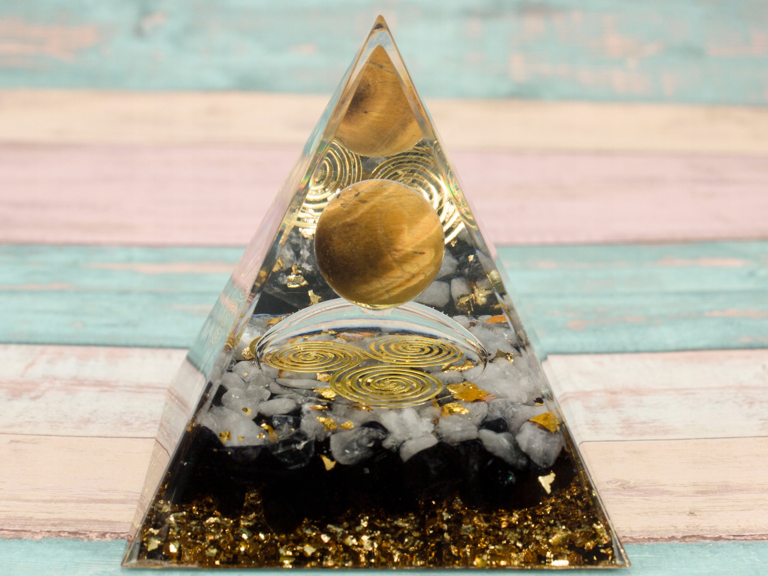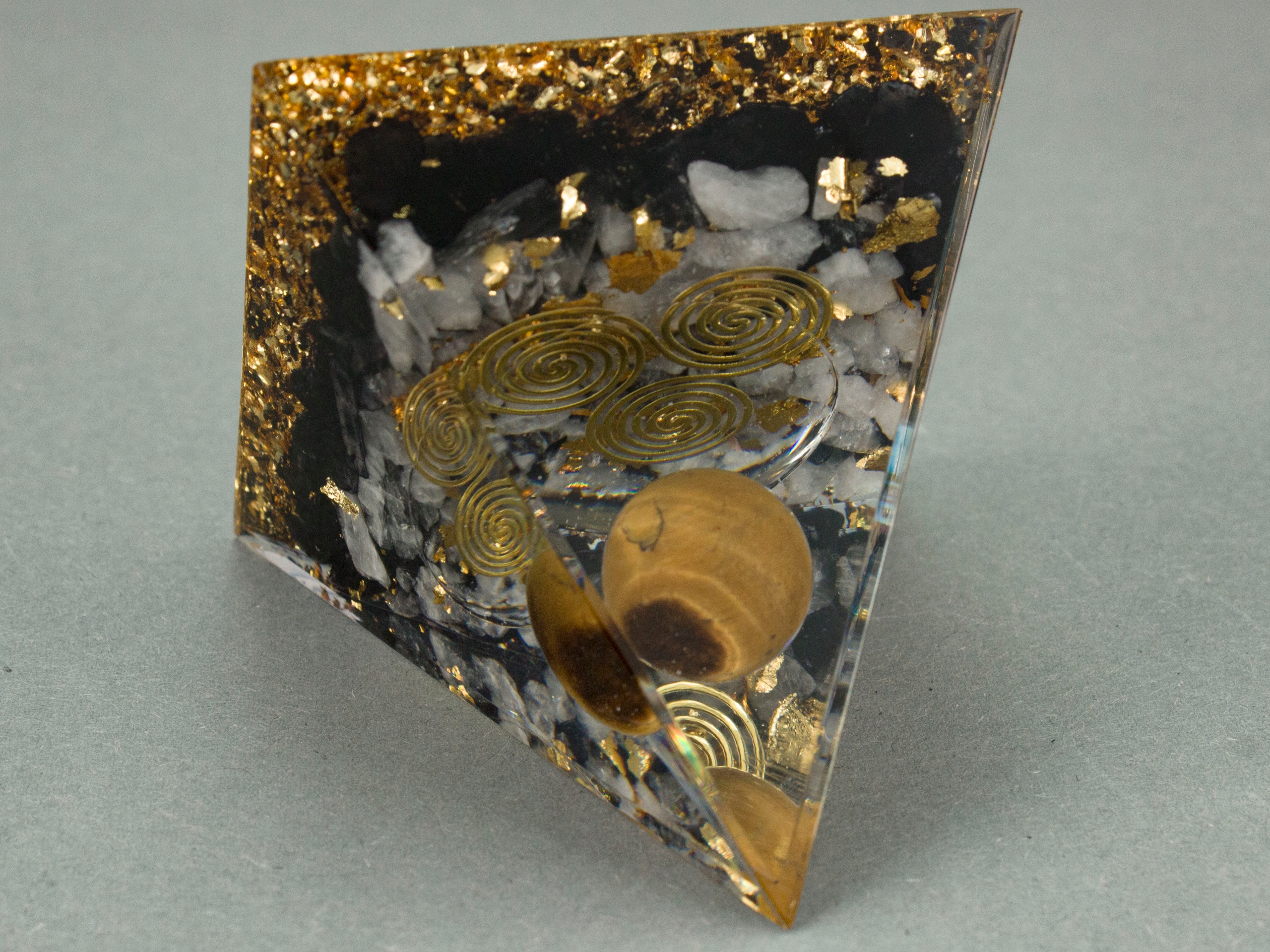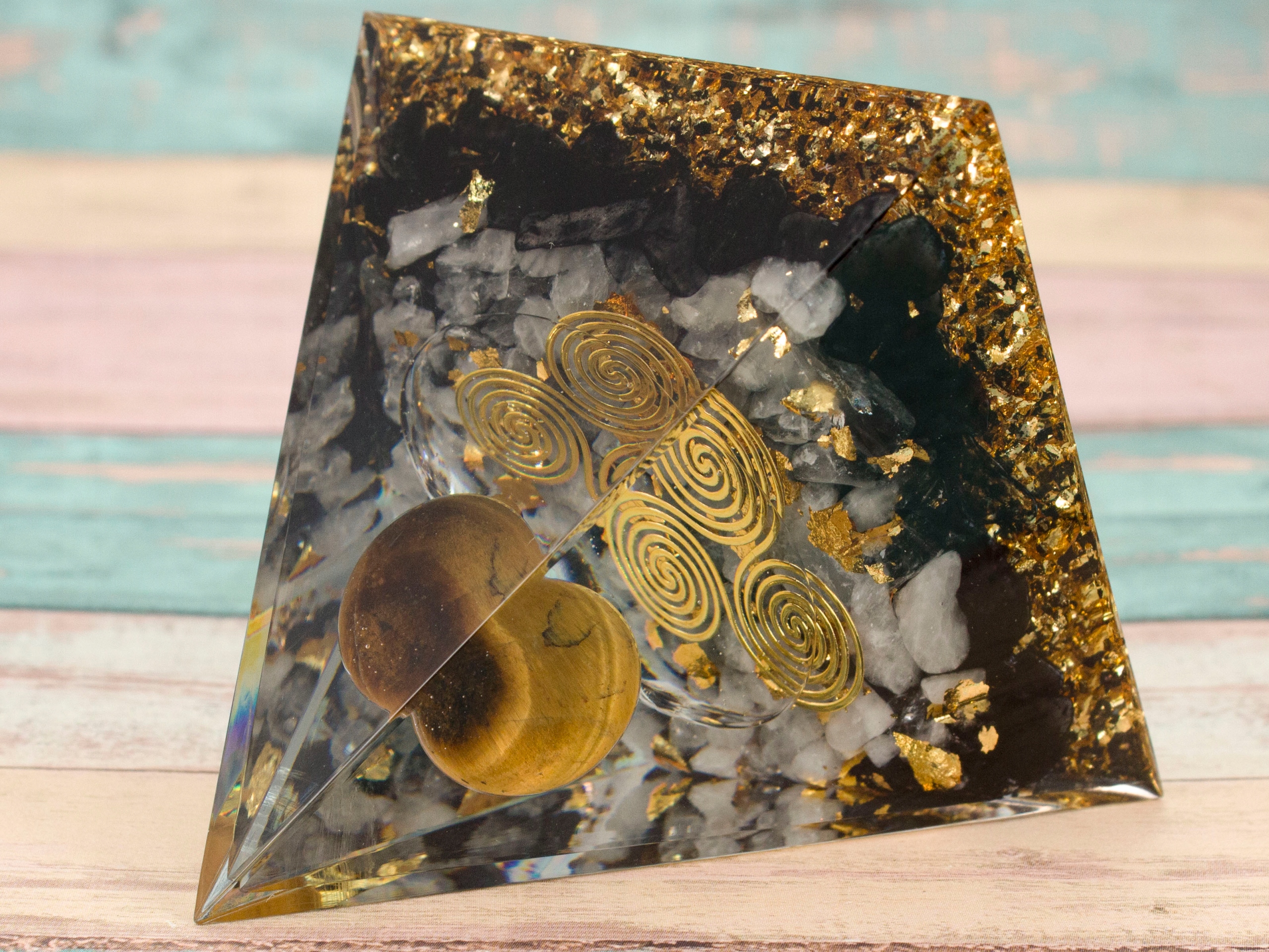 Красивая оргонитовая пирамида — сфера тигрового глаза, красивое украшение с кусочками меди, хрусталя, дымчатого кварца и золотой фольги, дающее энергию и защиту всему телу, а также защиту от токсичных людей.