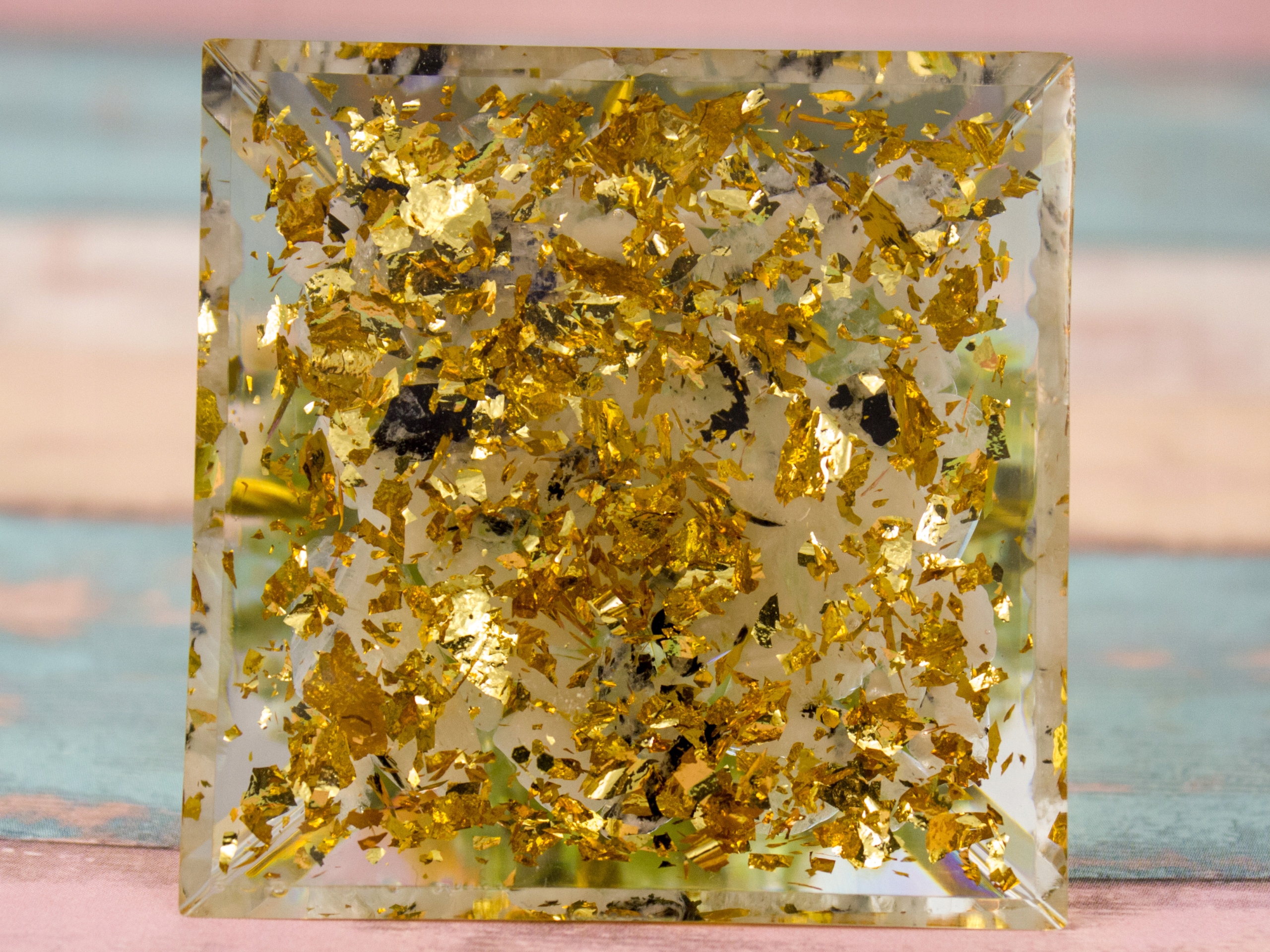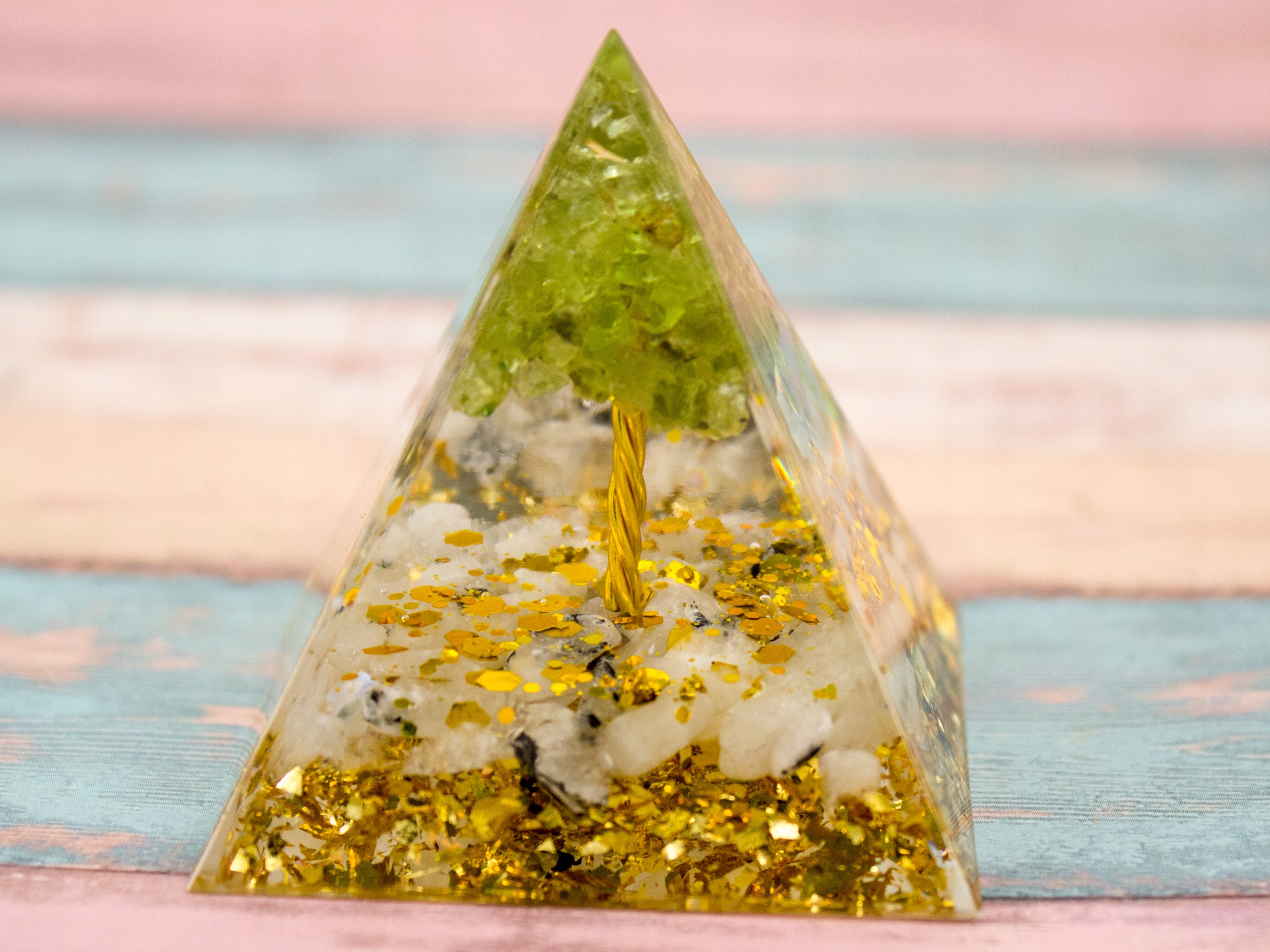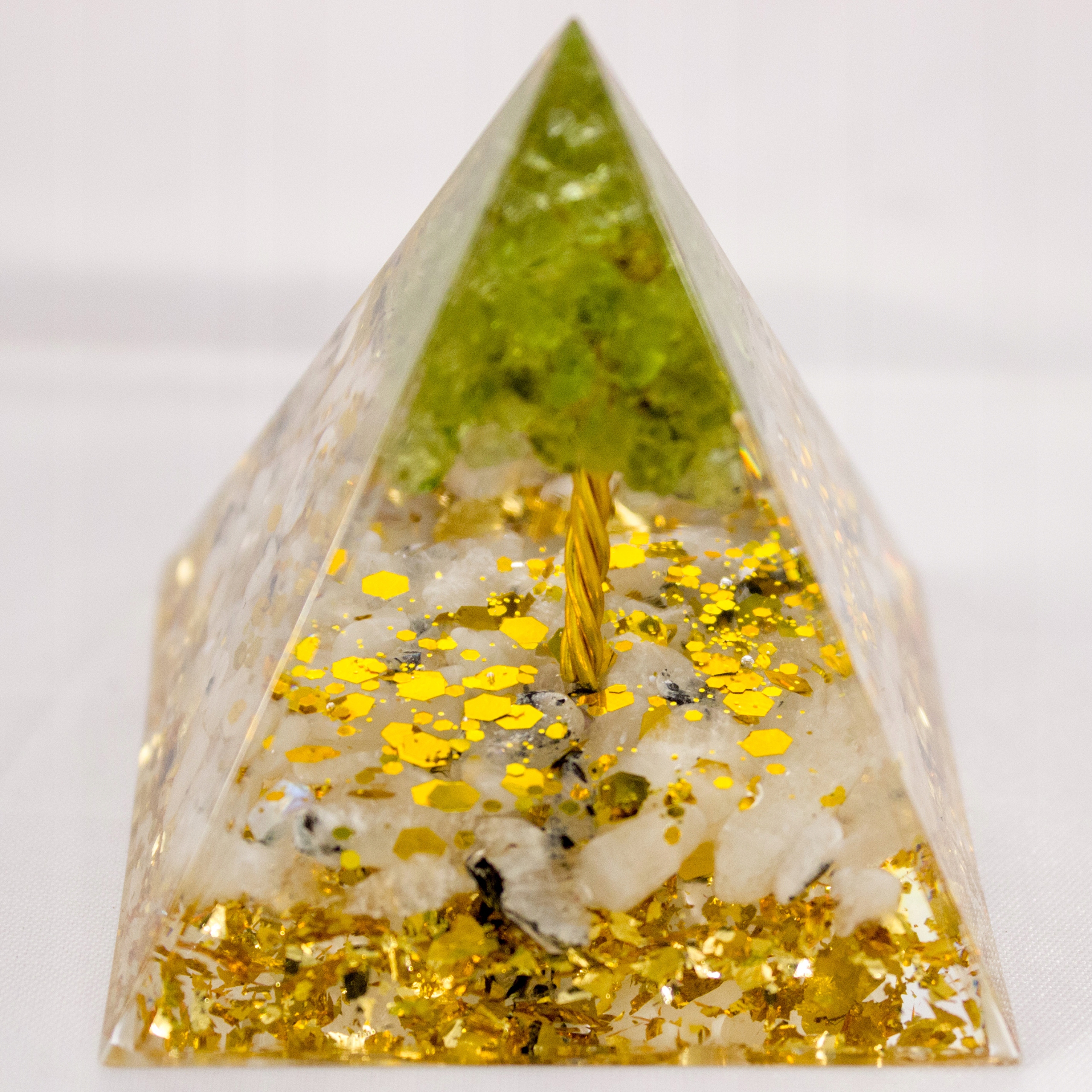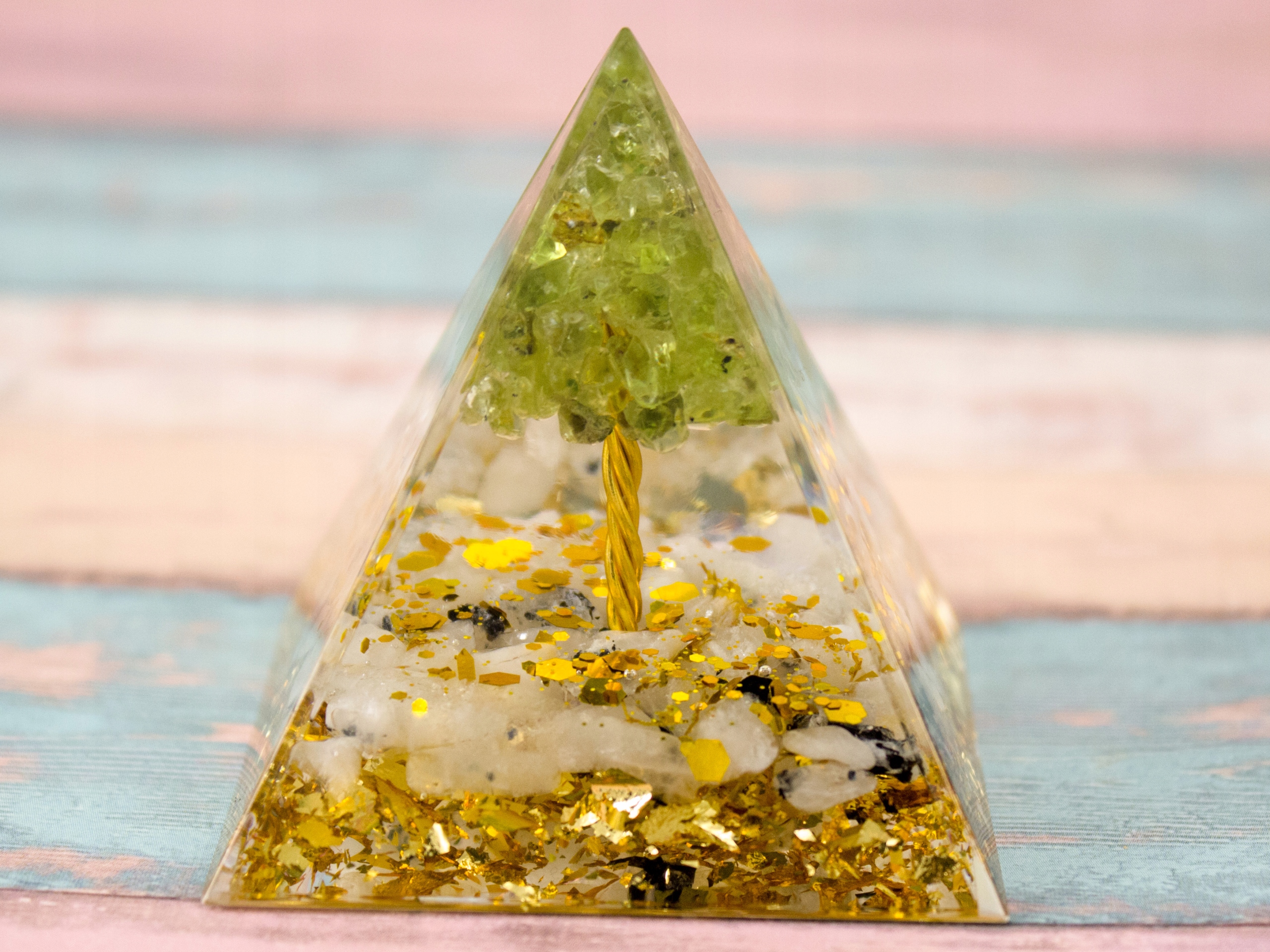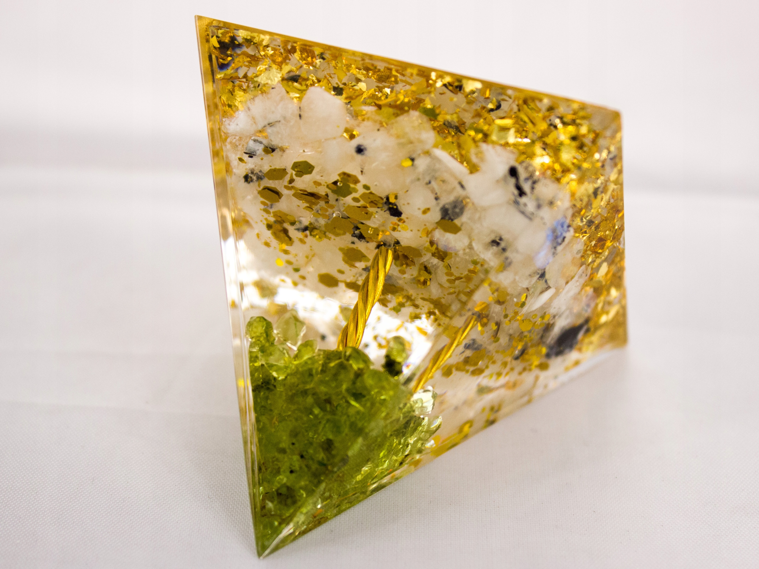 Красивая оргонитовая пирамида с апофиллитом, медью и зеленым перидотом, образующими внутри форму дерева. Помимо красивого внешнего вида, который становится еще более элегантным благодаря золотым блесткам и красивой переливающейся на свету золотой фольге внизу, минералы обладают сильным положительным энергетическим эффектом, который еще больше усиливается частицами золота.