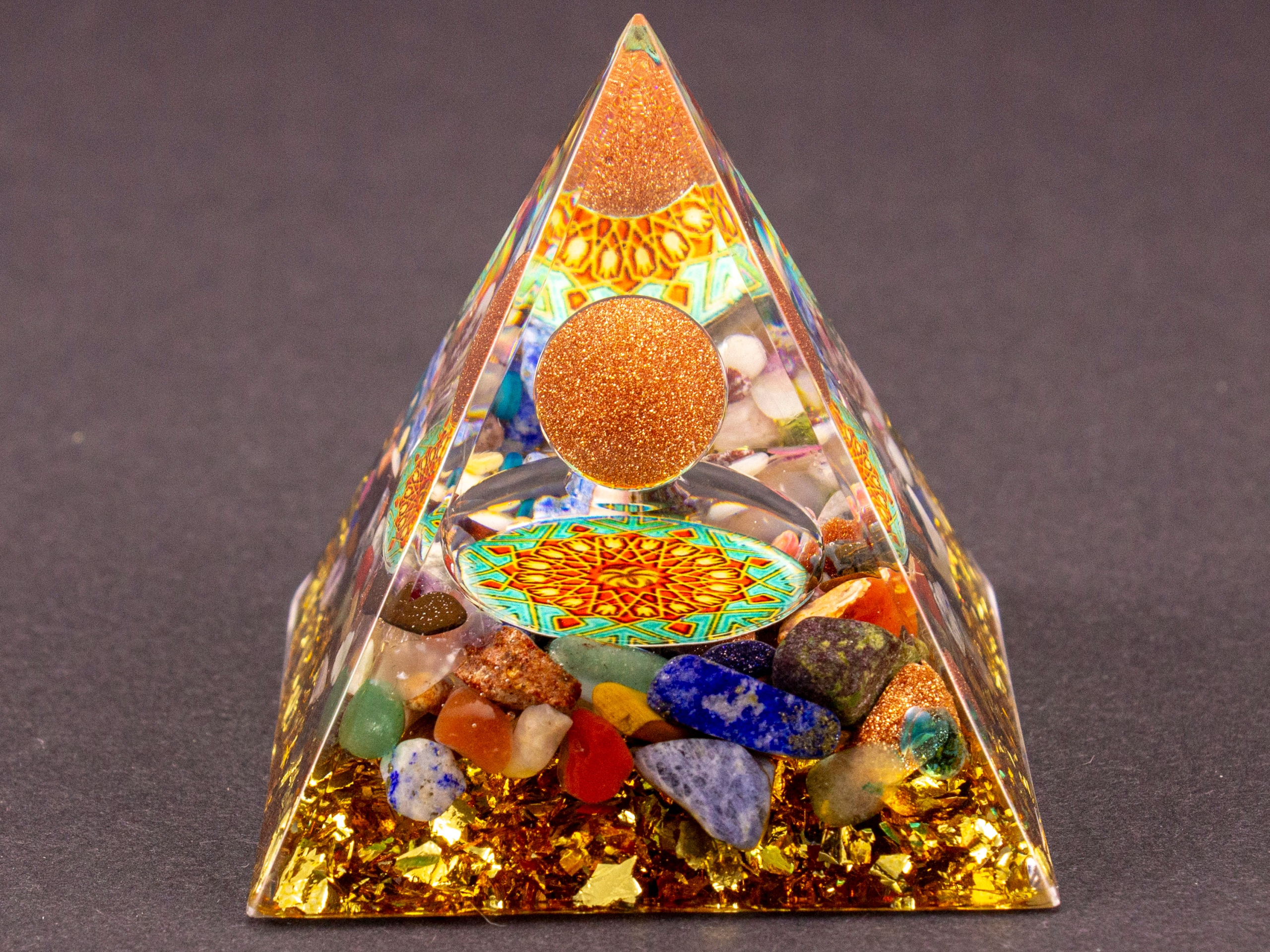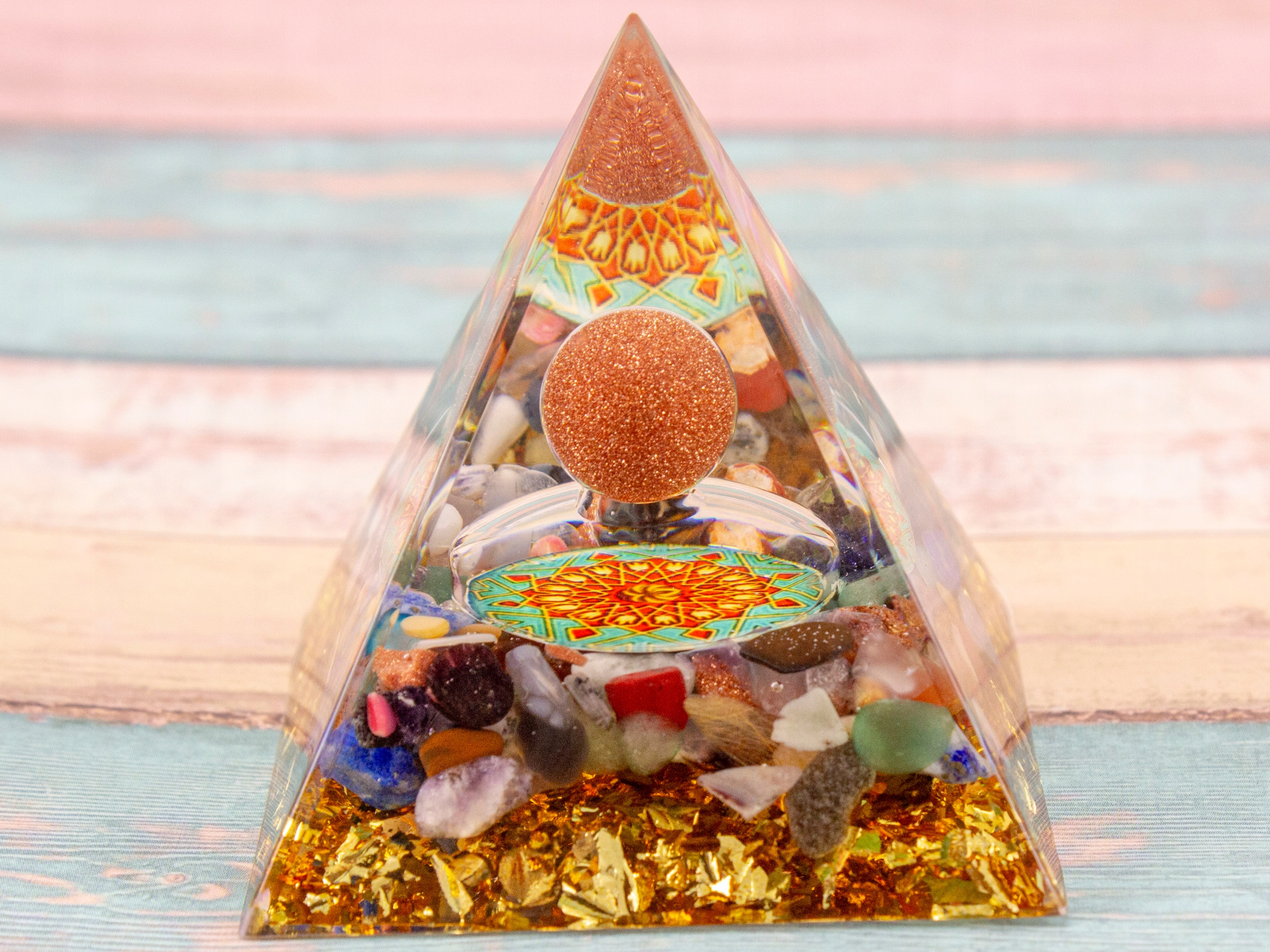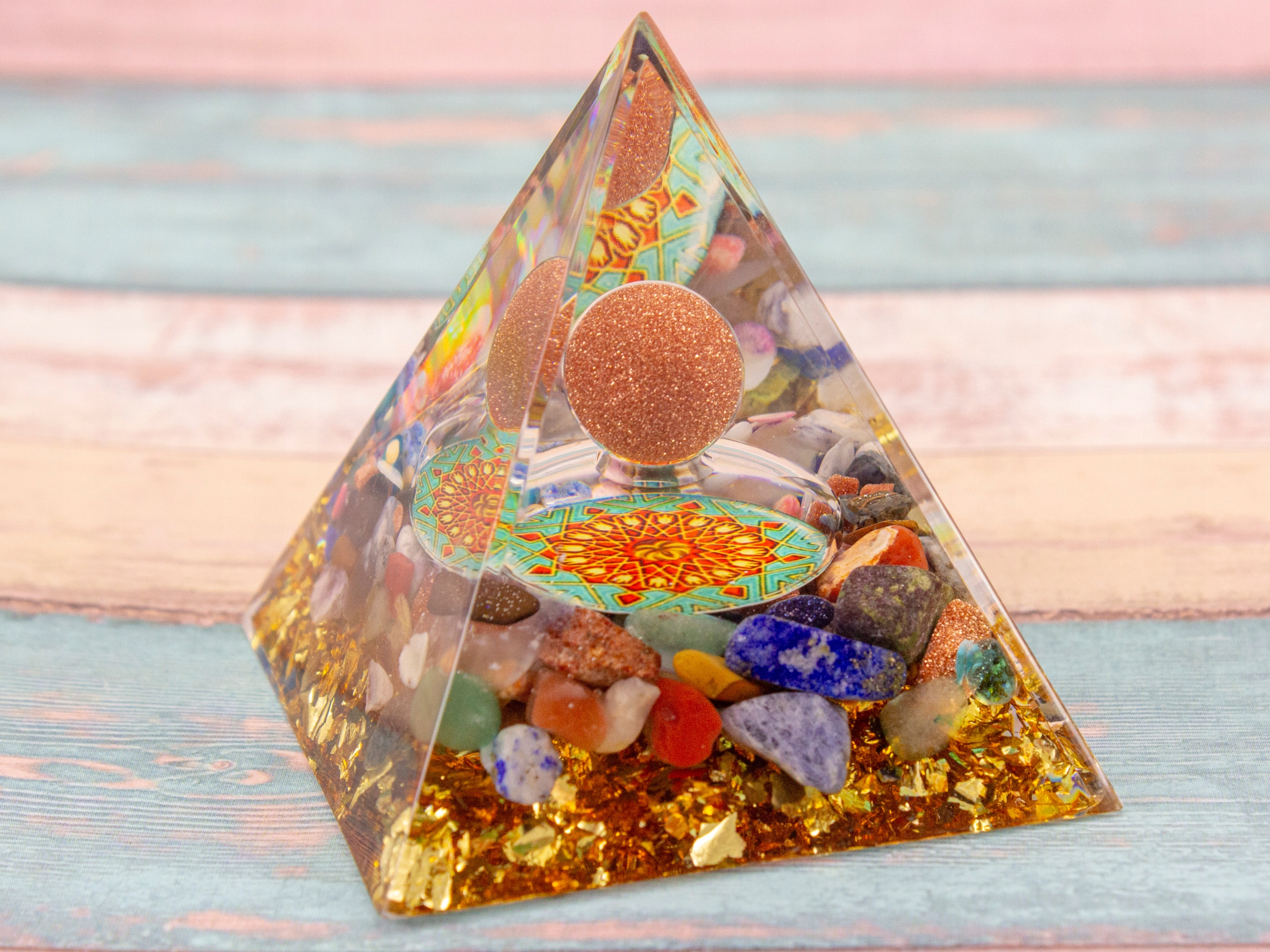 Осветите свою жизнь энергией солнца с оргонитовой пирамидой с яркими цветами и разносторонней силой многих минералов, воздействующих на все 7 чакр .