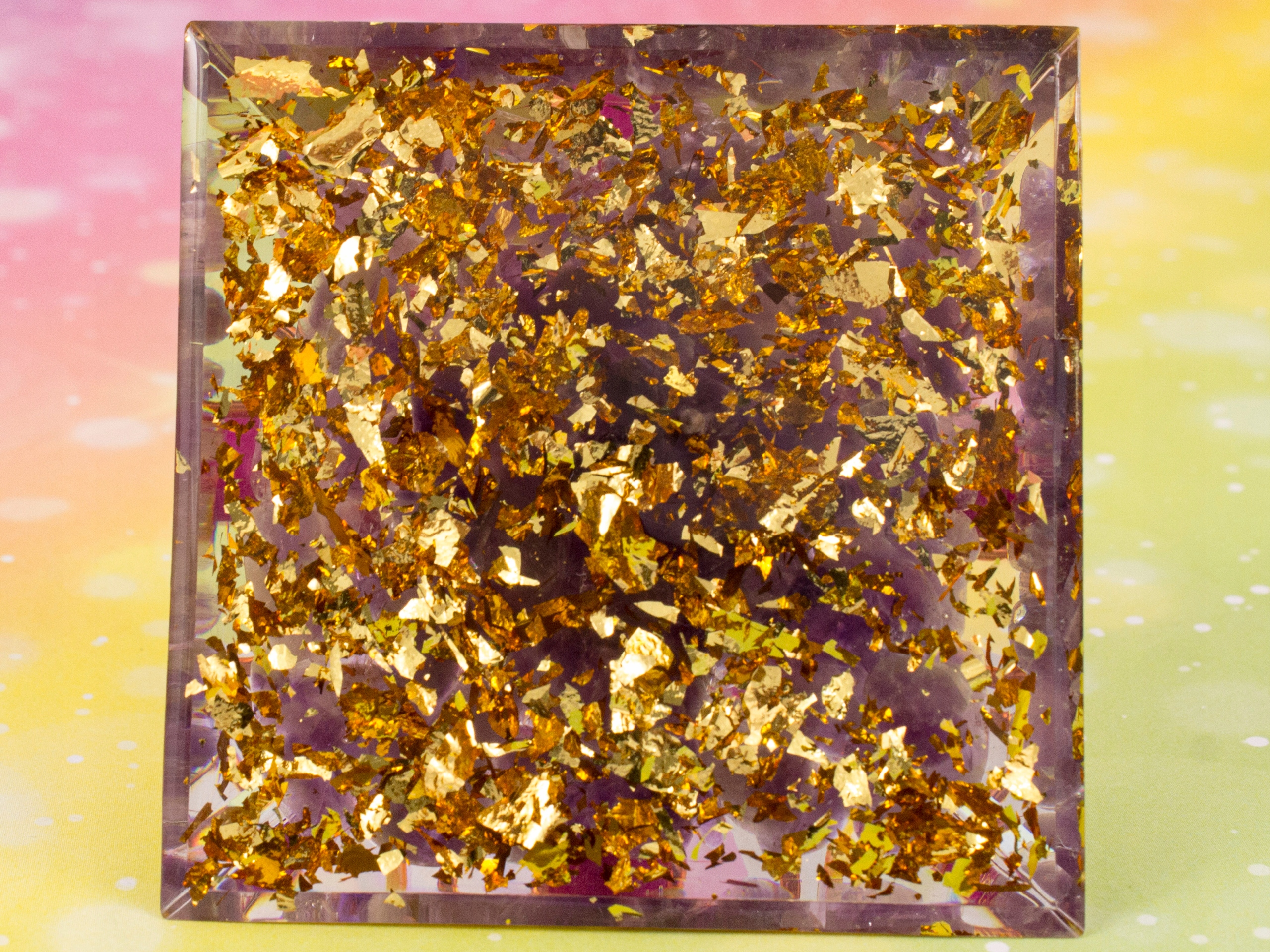 Золотая фольга усиливает энергетический эффект, а за счет красивого блеска придает пирамиде красоты, сочетаясь прекрасно сочетается с цветами других минералов.