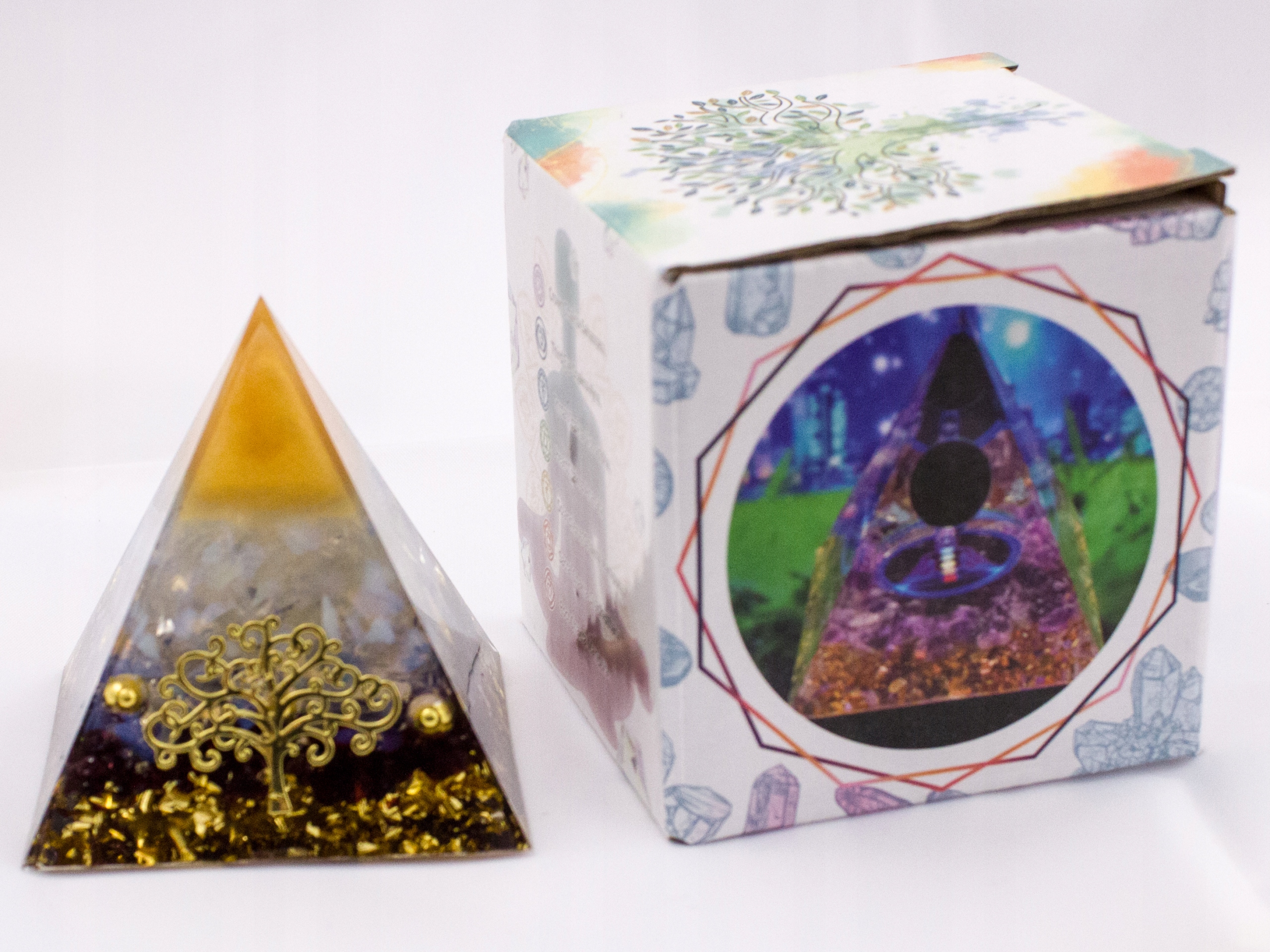 Эта пирамида оказывает полезное влияние на каждую из семи чакр , и благодаря камням, минералам, которые не только выглядят красиво, но и имеют свою собственную силу, энергию и исцеление, повышают ценное влияние очищения и разблокировки чак, приносят хорошее, счастье, здоровье.
