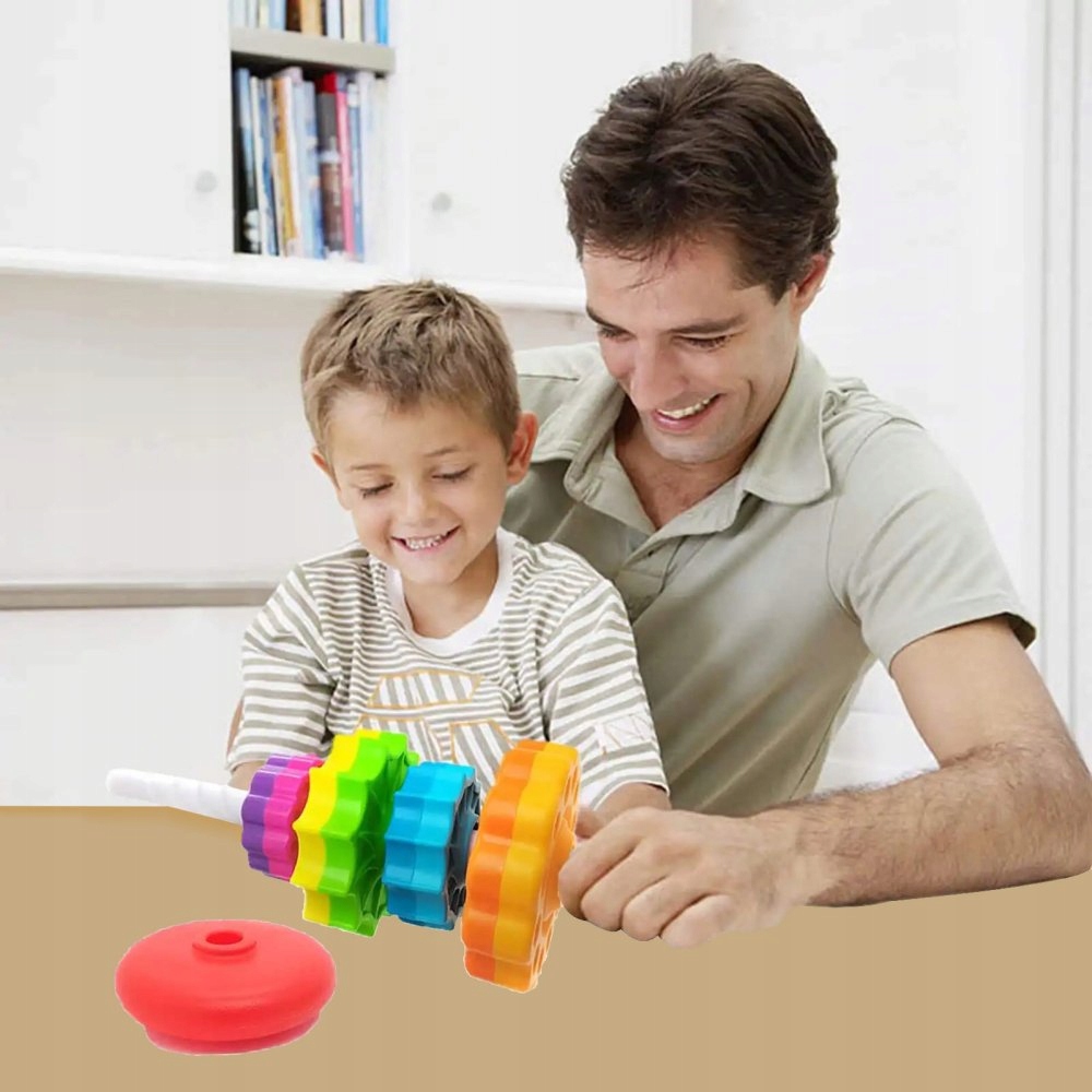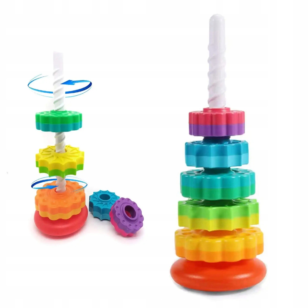 Эта игрушка состоит из нескольких красочных кругов, которые последовательно надевают на центральную палку, создавая красочную башню.