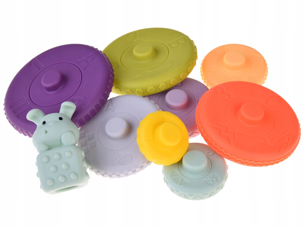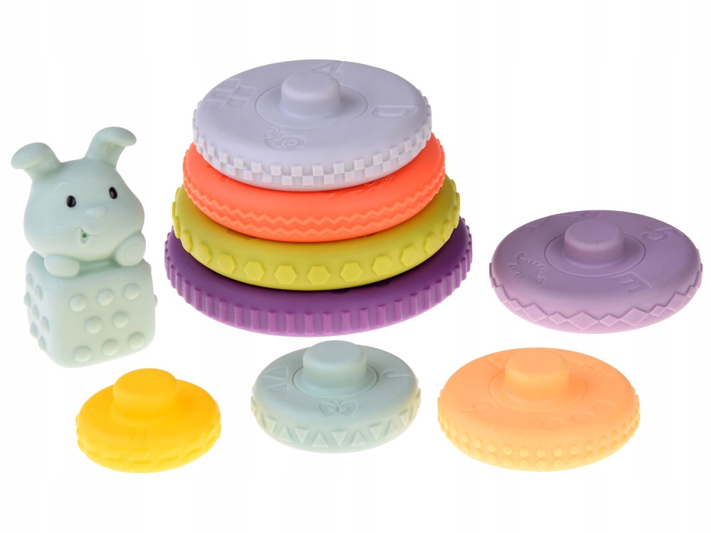 Красочная, сенсорная пирамида, состоящая из мягких резиновых колес и радостного кролика, отлично подходит для ребенка с 6 месяцев