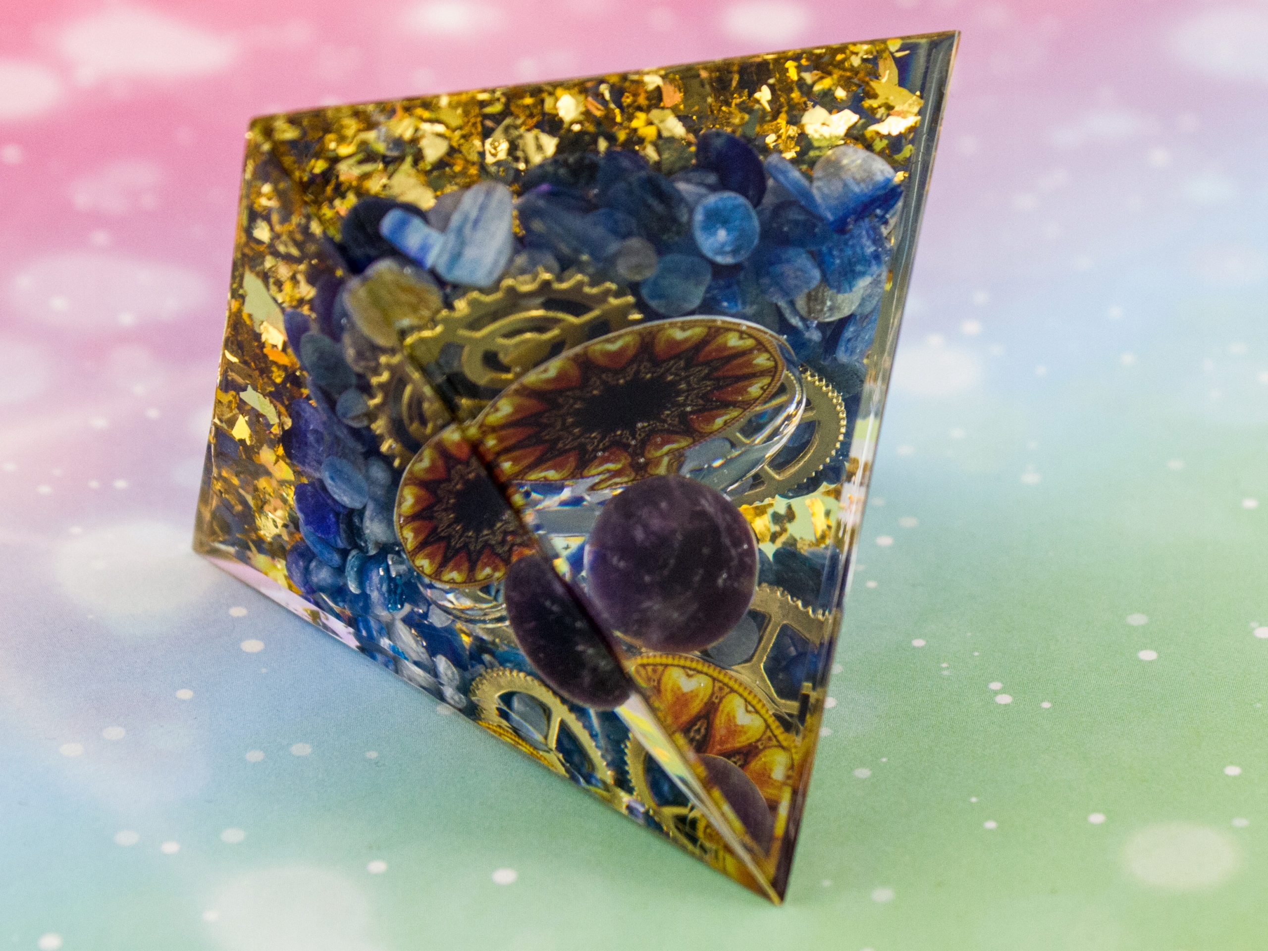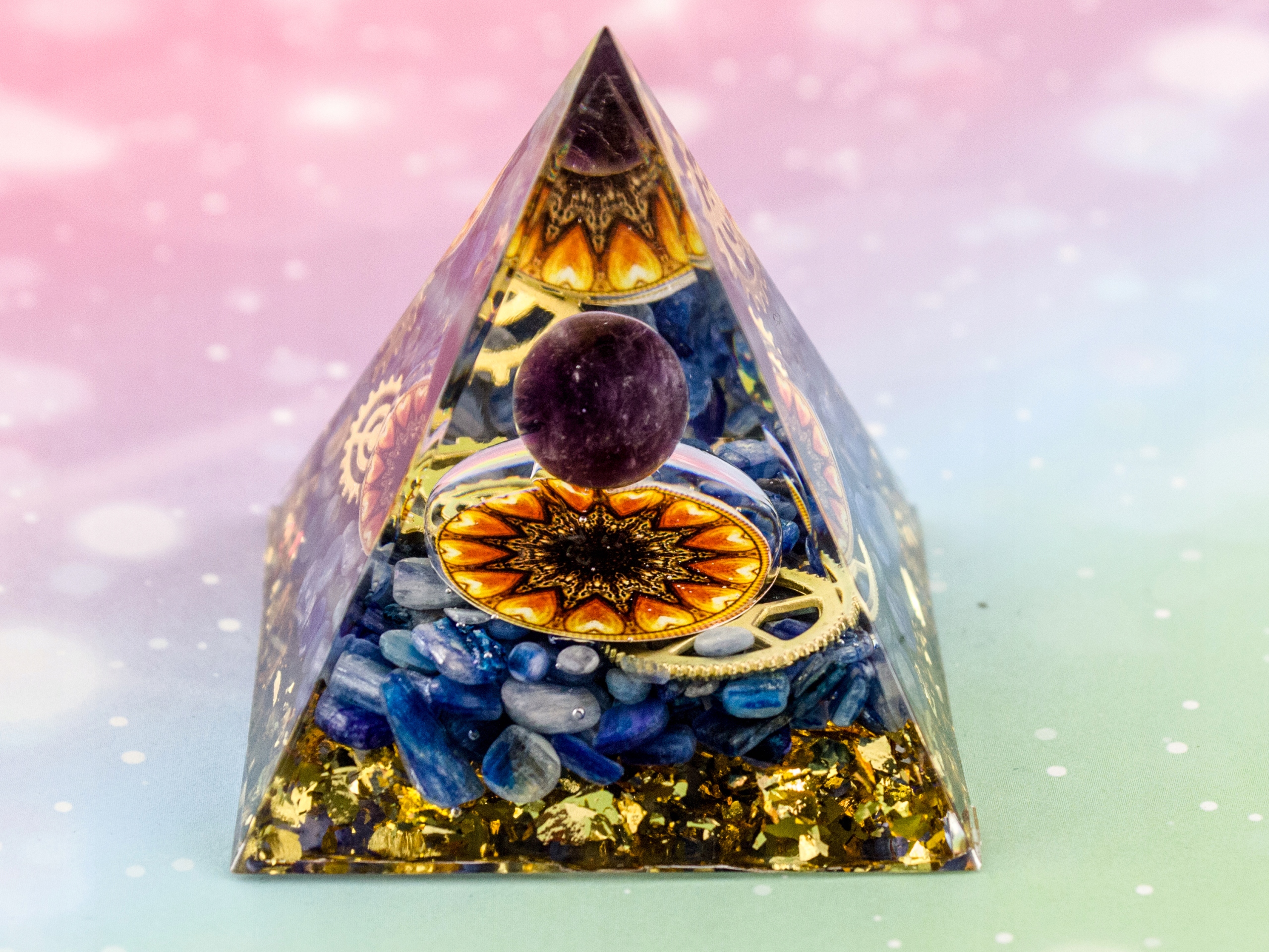 Красивая пирамида с аметистовым шаром, необычным щитом и двумя медными шестеренками, с кианитом и золотой фольгой - воздействующая на все 7 чакр.
