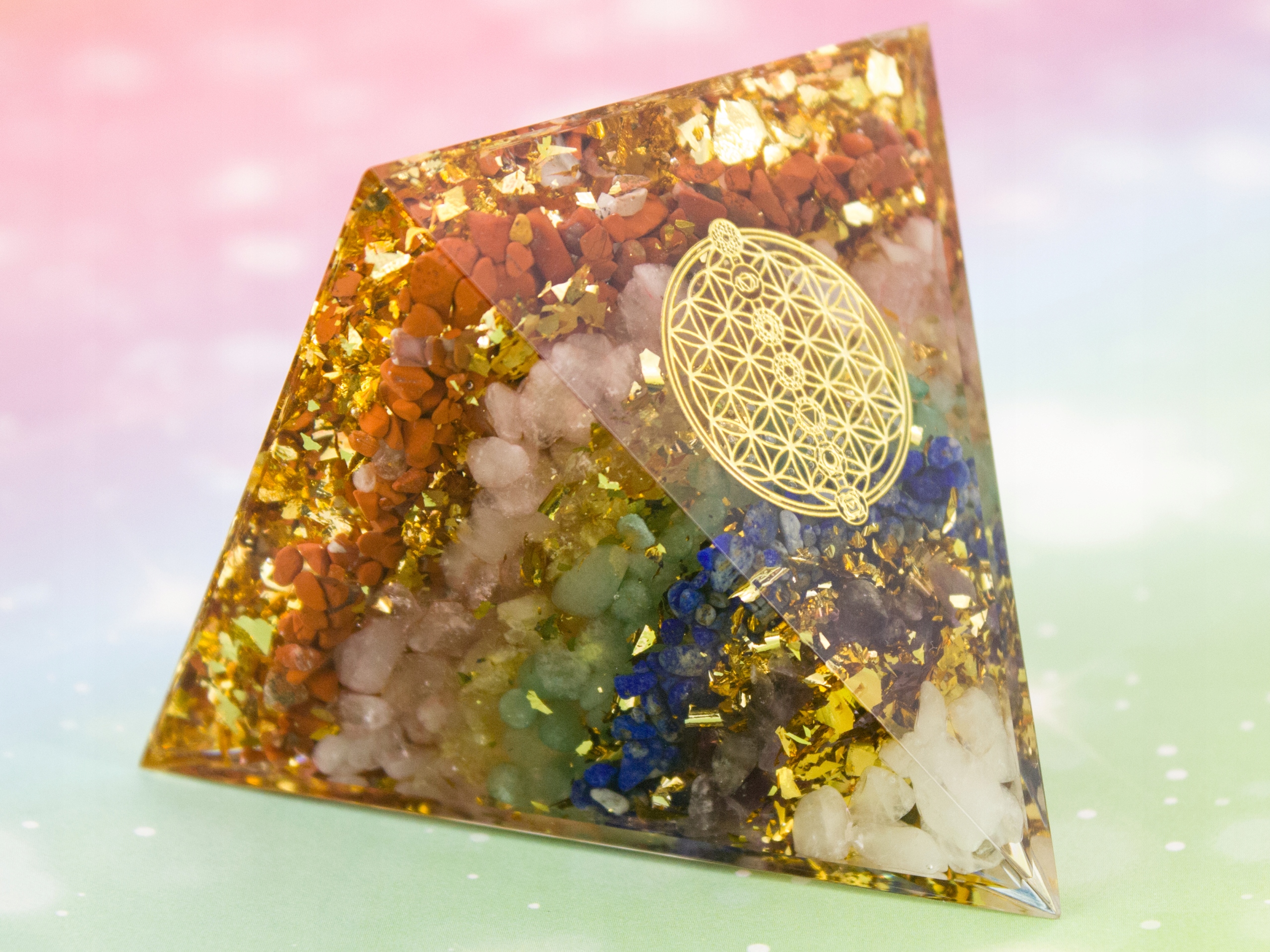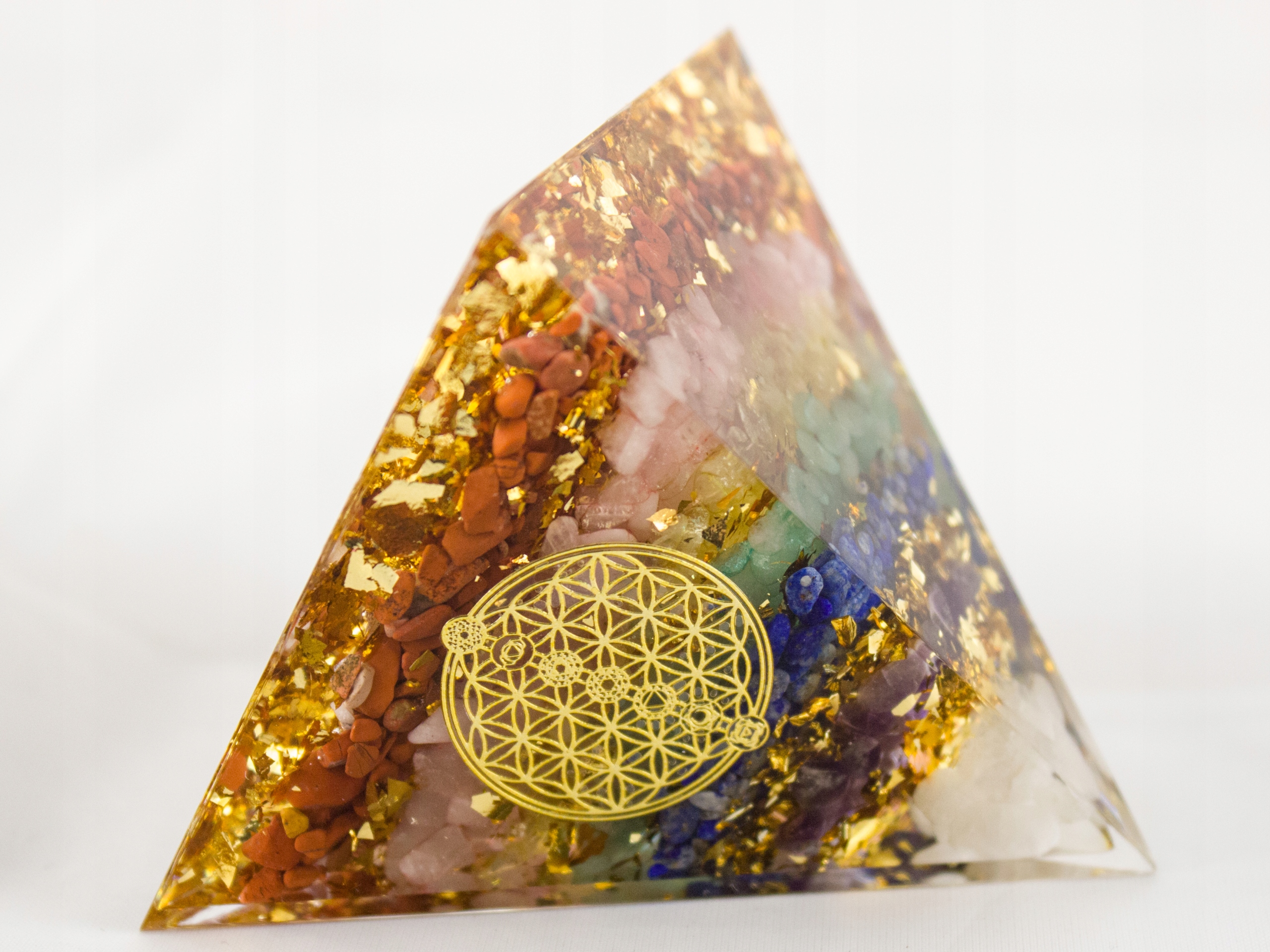Оргонитовая пирамида с белым кристаллом, аметистом, лазуритом, зеленым авантюрином, цитрином, розовым кристаллом, яшмой, тигровым глазом и аметистом в слоях красиво расположенные камни с символом Цветка Жизни.