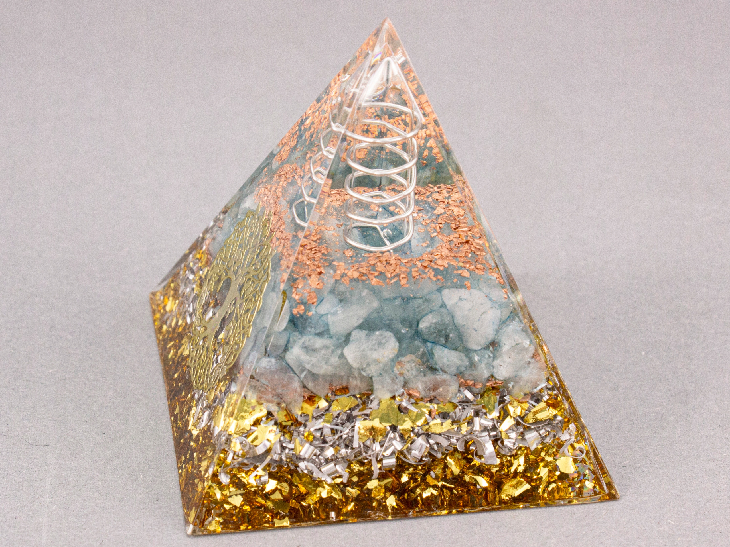 Пирамида оргонит аквамарин топаз белый медный диаметр шуи 6 см.