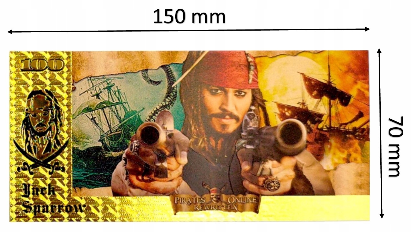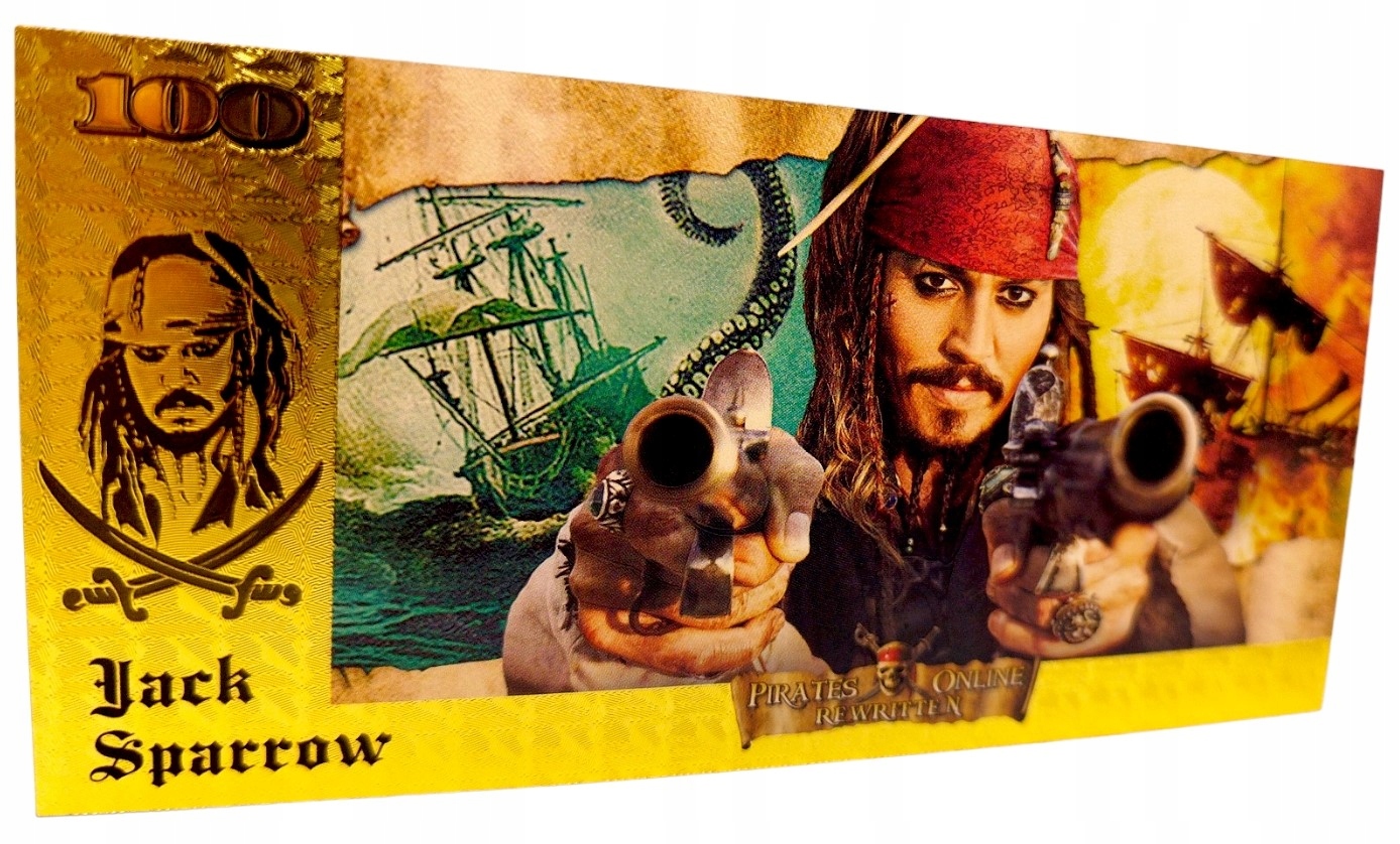 На аверсе банкноты изображен Джек Воробей. Это вымышленный персонаж из серии фильмов «Пираты Карибского моря», которого сыграл Джонни Депп. Он капитан корабля «Чёрная жемчужина» и один из самых узнаваемых пиратов в истории кино. Джек Воробей известен своей характерной внешностью: беспорядочно спутанными дредами, множеством временно приобретенных ценностей и необычными манерами.