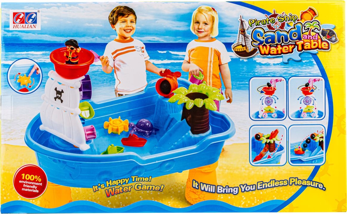 весь набор - таблица, которая выполняет функции песочницы - по внешнему виду напоминает пиратский корабль. оснащен пусковой установкой «Кэннон», ладони, которая также является слайдом для мяча и лодок. песок или вода. одна игрушка и скрывает много удовольствия.