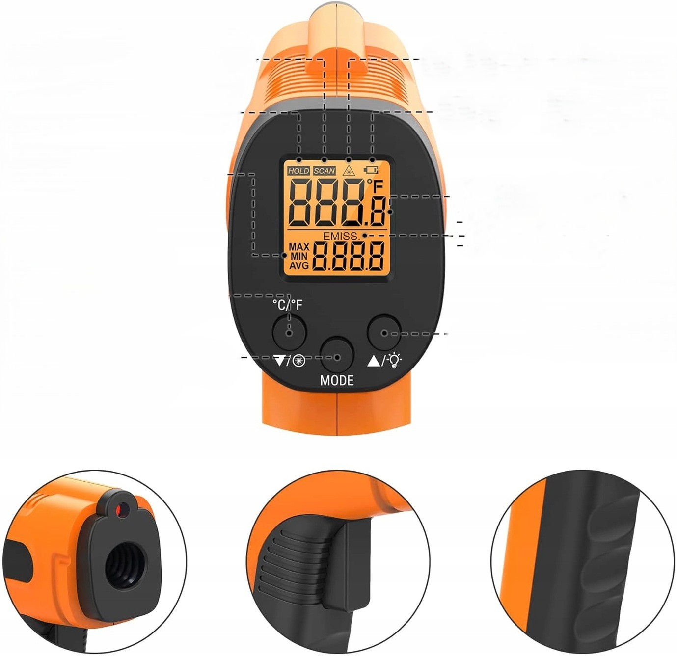 ultrashybka Реакция: благодаря отношению расстояния до точки 12: 1 и время реакции <500 мс. Этот пирометр использует инфракрасную технологию для измерения температуры в диапазоне -50 ° C -550 ° C (-58 ° F -1022 ° F), что позволяет детектору тепла измерить температуру поверхности с безопасного расстояния, даже над темой кипящего и ниже точки, этот температурный индикатор идеально подходит для приготовления пищи, обслуживания автомобилей, домашнего ремонта и т. Д.