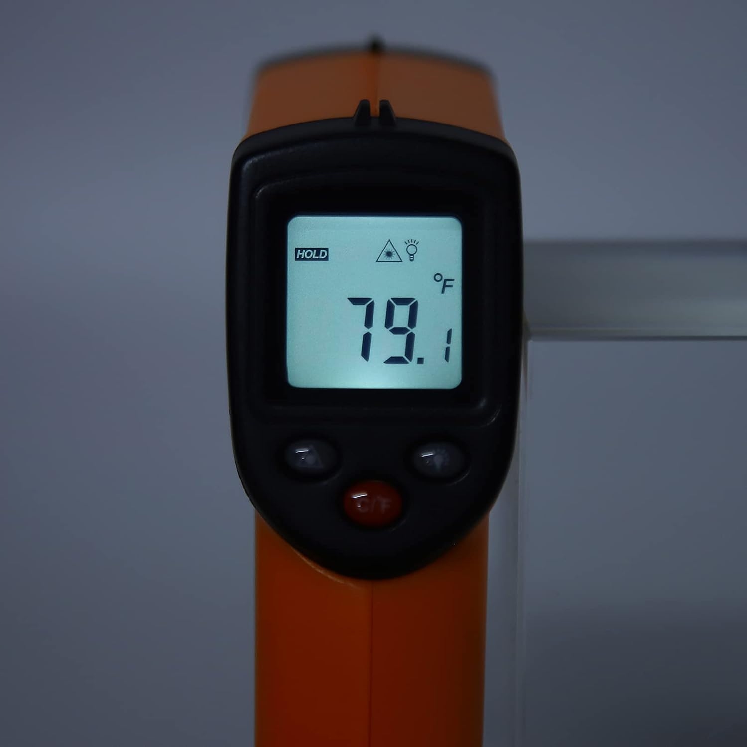 Пирометр, бесконтактный инфракрасный термометр. Он оснащен лазерной указкой, позволяющей точно нацеливаться на исследуемую точку. Устройство оснащено дисплеем с подсветкой и имеет функцию автоматического отключения. Измеряет температуру в диапазоне от -50°C до 400°C.