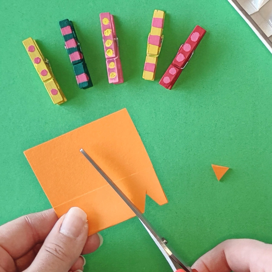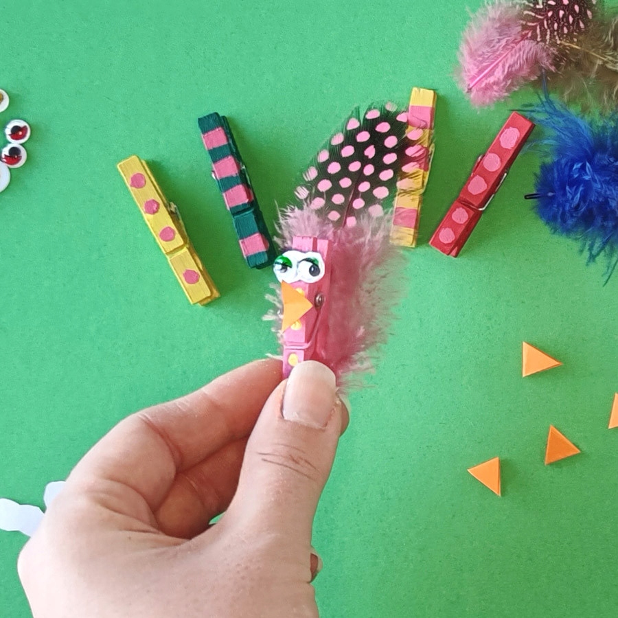 Вырежьте из бумаги глаза. Приклейте глаза к листу бумаги, затем приклейте их к листу бумаги, а клюв приклейте к прищепке. Выберите ручку
