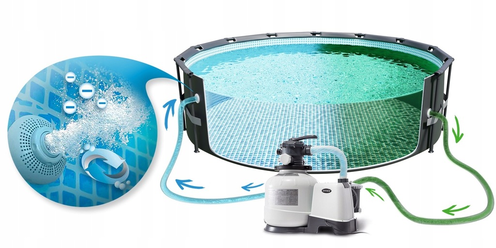 Intex представлена rэволюция в садовых бассейнах - аэрация воды при фильтрации, имеется во всех насосах этого производителя. Насос производит миллионы пузырьков воздуха, что облегчает очистку и фильтрацию воды.