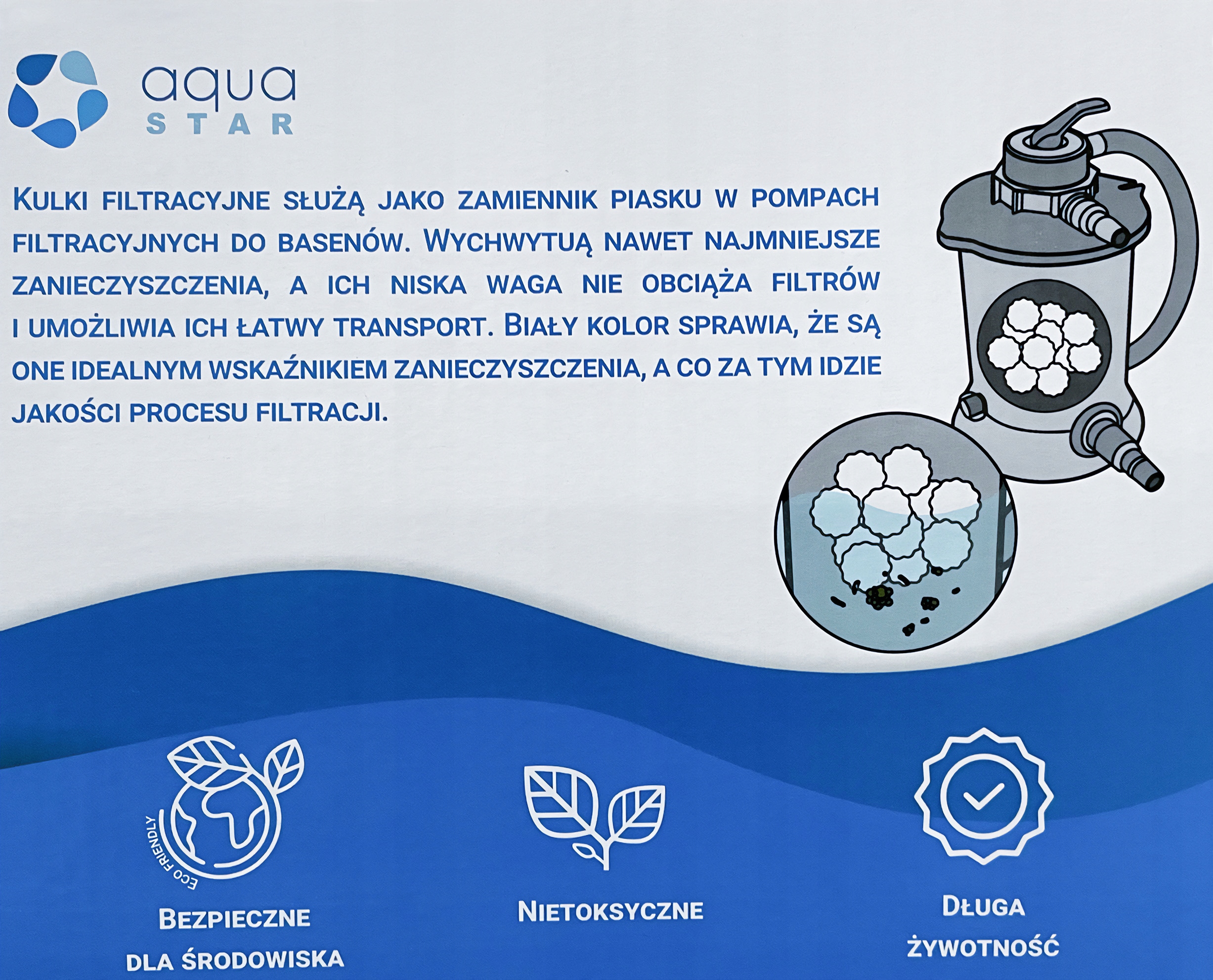 Инновационный фильтрующий вкладыш последнего поколения АКВАСТАР является экологически чистой альтернативой песку и кварцевому стеклу благодаря благодаря гораздо более длительному сроку службы и превосходным свойствам фильтрации и удержания. Специальные фильтрующие шарики способны очистить воду в вашем бассейне в 15 раз быстрее и эффективнее.