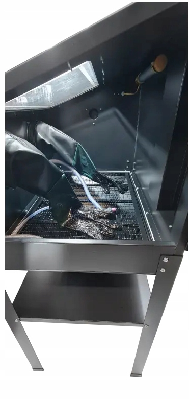 Имеет закрытую герметичную кабину с прочными рабочими перчатками, расположенными на устойчивых ножках, повышающих эргономику работы. Пистолет с соплами диаметром 4-5-6-7 мм, вентиляция, регулировка давления 4-8 БАР, внутреннее освещение и защита стекла.
