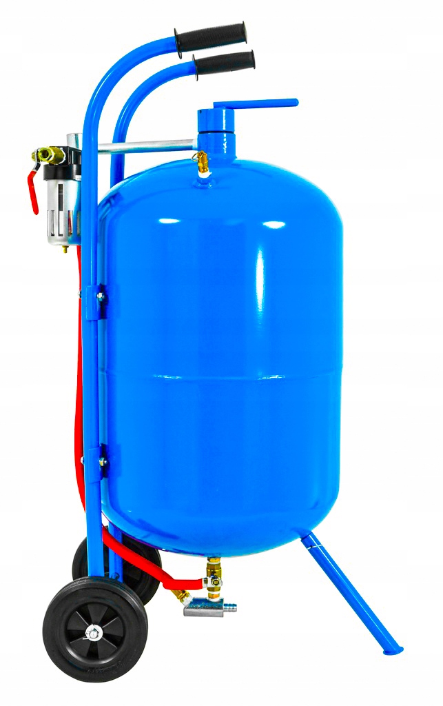 Пескоструйный аппарат оснащен резиновыми колесами и удобными ручками, облегчающими его работу. движения и повышения комфорта работы оператора устройства.