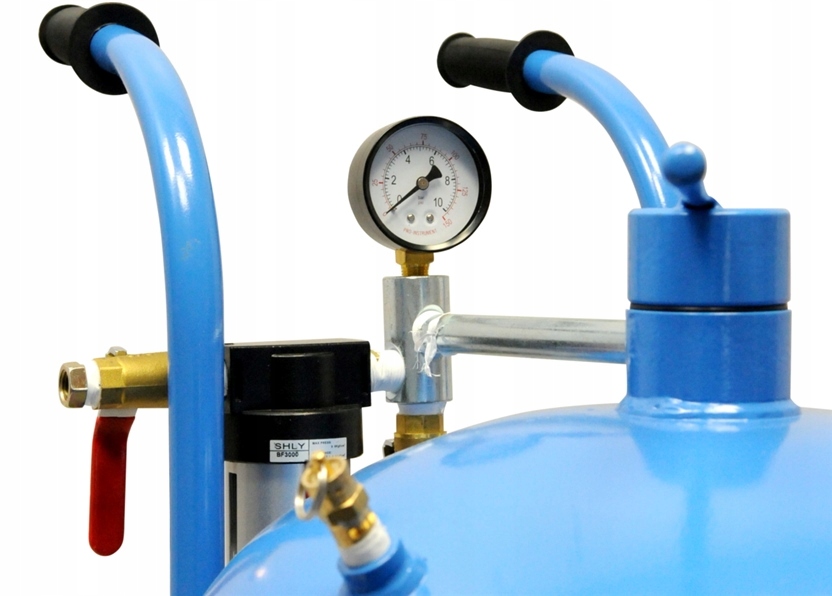 Пескоструйный аппарат оснащен резиновыми колесами и удобными ручками, облегчающими его перемещение и повышающими комфорт оператора.