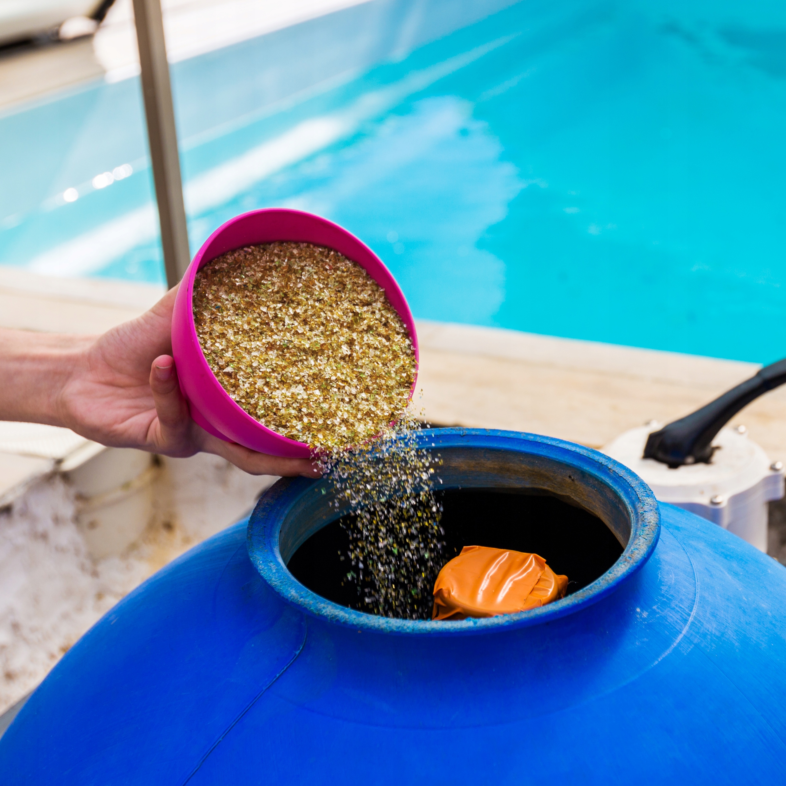 6️⃣ Вылейте воду за пределы бассейна после первой промывки песка.