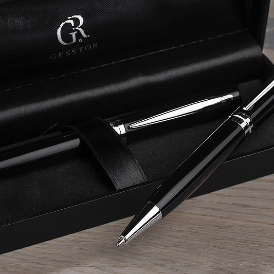 Письменный набор классической элегантности, включающий шариковую ручку и шариковую ручку. Упакован в коробку из эко-кожи. Все элементы набора отмечены изящным логотипом бренда GESSTOR, который символизирует продукцию исключительного качества и красивого дизайна.