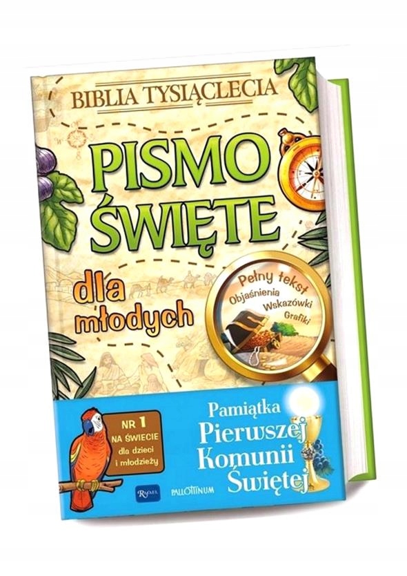 Уникальное издание «Тысячелетней Библии», подготовленное специально для юных читателей. Впервые в Польше полный текст Библии в самом ценном переводе Паллоттина был объединен с самым популярным изданием Библии в мире в категории для детей и молодежи, обычно называемым Библией с попугаем. Графика, комментарии, пояснения, курьезы, инструкции, приключенческий стиль, красочные карты и многие другие элементы подготовлены для того, чтобы юные читатели могли понять и полностью осознанно использовать преимущества Слова Божьего. Святая Библия для молодежи также обладает всеми признаками семейной Библии. Это издание, как никакое другое, может использоваться всеми поколениями семьи, читая индивидуально и коллективно.