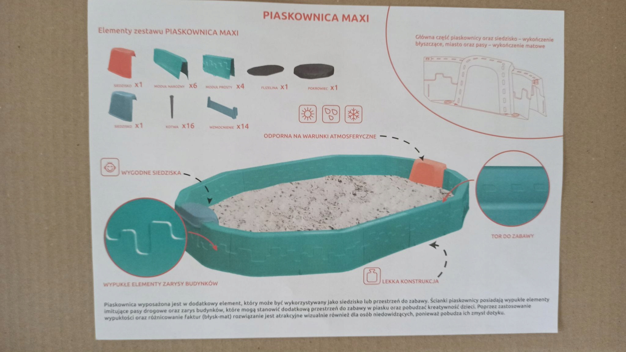 Преимущество песочницы в том, что она очень проста и легка в сборке (песочница состоит из нескольких элементов) и ее можно быстро промыть мойкой высокого давления. Безопасно для детей.