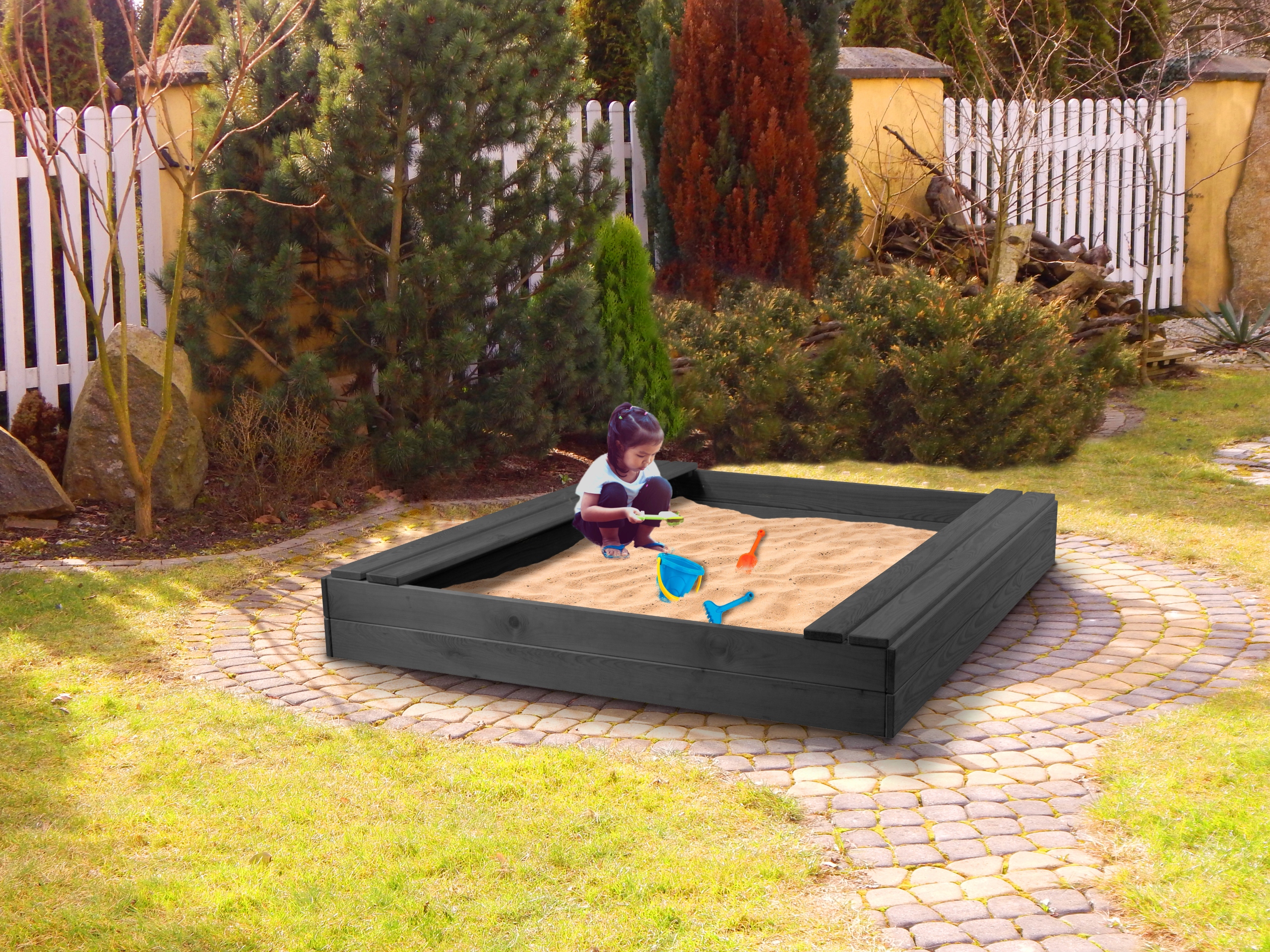 Песочница легко собирается и красиво смотрится в любом саду.