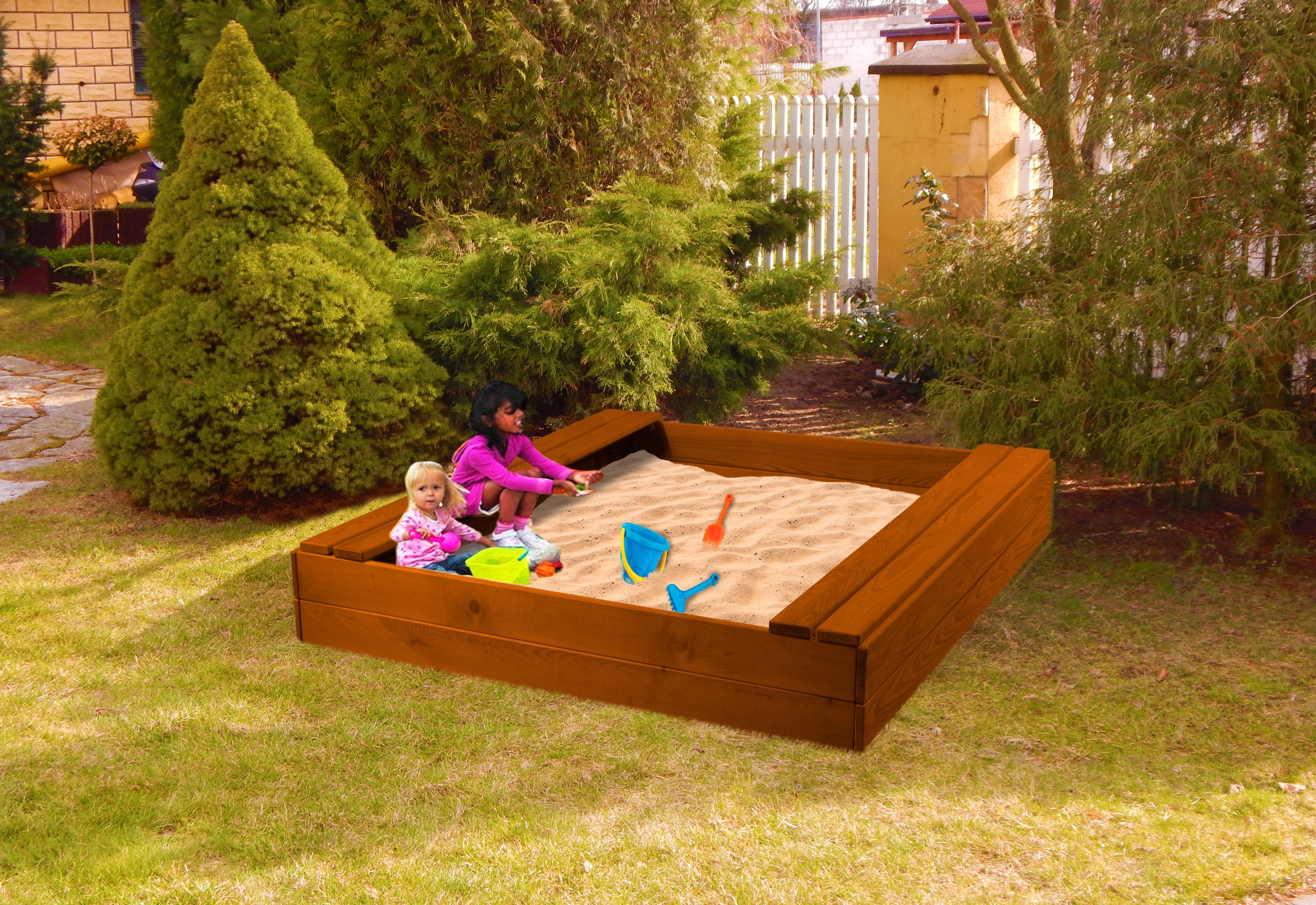 Песочница изготовлена из сухой четырехгранной древесины хвойных пород и не имеет острых краев.