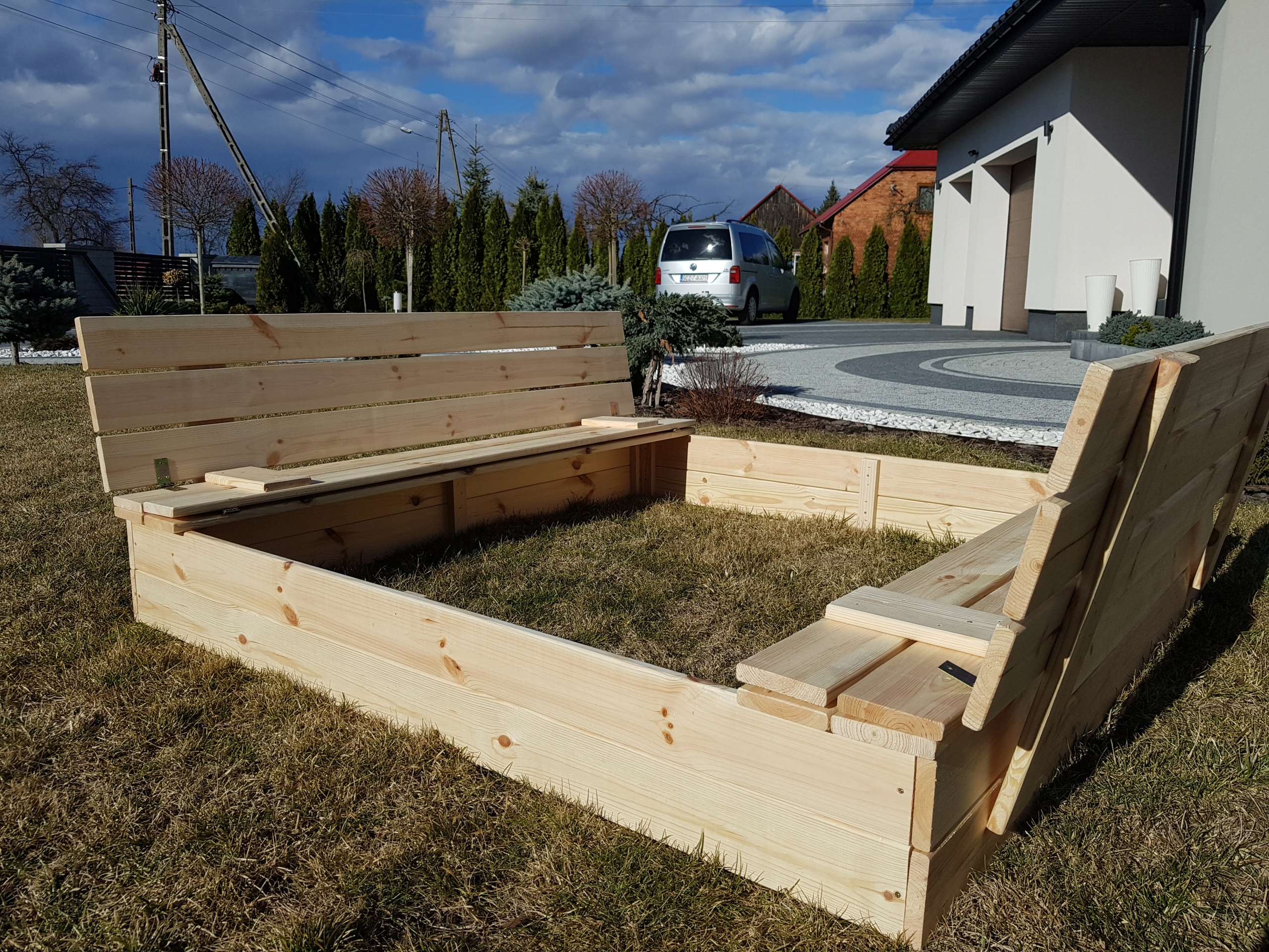 Большая песочница Преимущество нашего Возможно собрать песочницу со скамейками, чтобы создать крышку, таким образом закрывая песочницу.