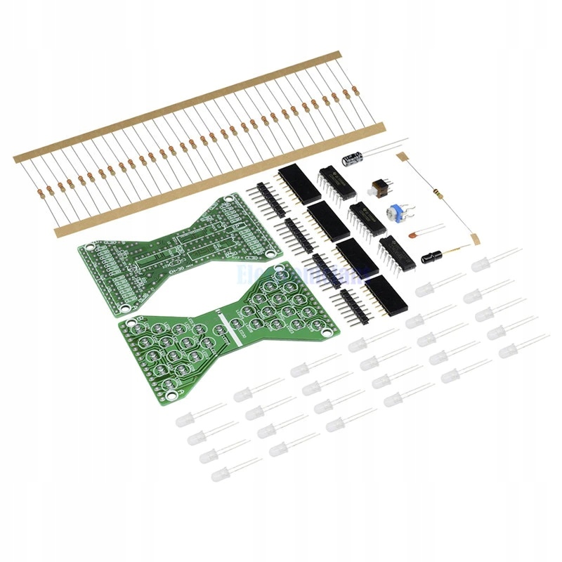 Схема сборки системы напечатана на доске. Необходимо обратить внимание на полярность в случае таких элементов, как конденсаторы, диоды, транзисторы. В случае со светодиодами более длинная ножка – это плюс +, у большинства элементов свои параметры описаны на корпусе. Резисторы могут иметь полосовую маркировку, их сопротивление и допуск можно прочитать с помощью калькуляторов, доступных в Интернете, или измерить с помощью мультиметра. Порядок сборки обычно произвольный, в зависимости от планировки, сначала собираем самые мелкие элементы.