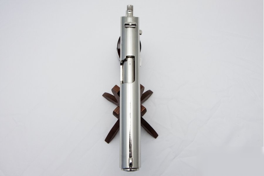 Репродукция пистолета с рукоятками из металла и лакированного дерева, с имитацией механизма заряжания и ударно-спускового механизма, функциональными кнопками предохранителя, съемным стволом и съемным магазином.