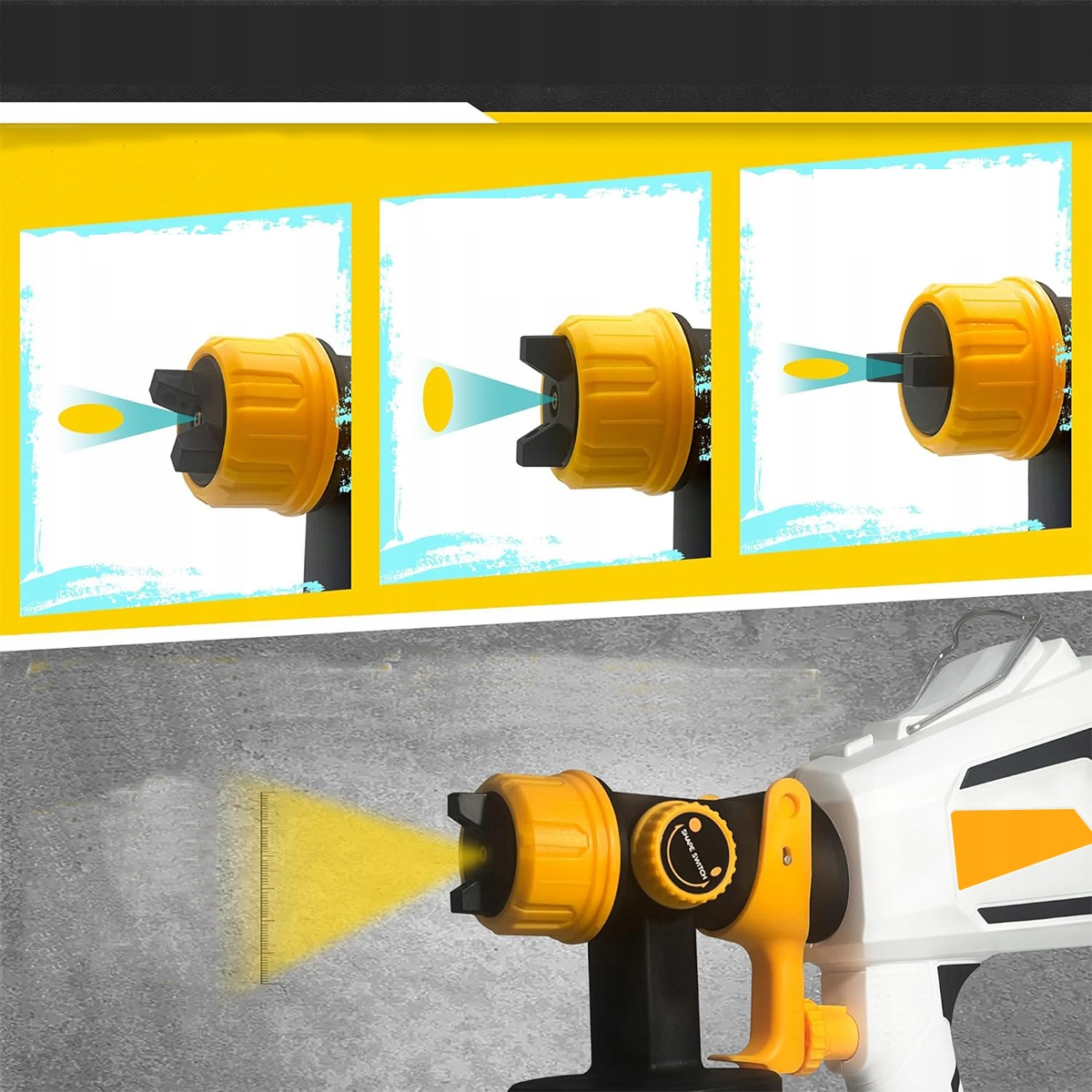 Распылитель краски можно настроить на 2 различных режима распыления: горизонтальный/вертикальный. Регулируемый регулятор потока контролирует поток краски, а кнопка переключения формы контролирует размер и расстояние распыления, чтобы избежать потери краски и добиться совершенства при каждом распылении.