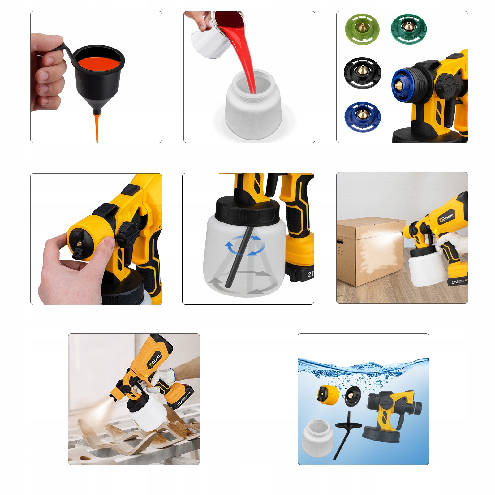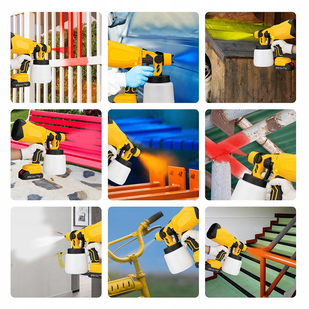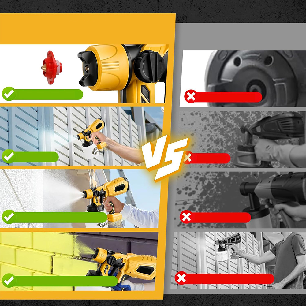 распылительные пистолеты для внутренних красок оснащены недавно улучшенным медным сопло, которое предотвращает повреждение, вызванное падением или сжиманием, не забивается легко и легко чистить. Контейнер 1000 мл обеспечивает достаточно краски для более длительного распыления без необходимости часто пополнять. Оснащены двумя батареями, которые полностью загружены всего за 2-3 часа, что значительно повышает эффективность работы.