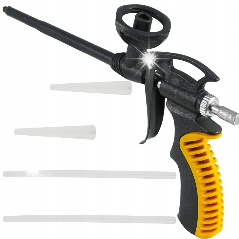 Сборный пенный пистолет, предназначенный для точного дозирования пенополиуретана из типовых баллонов, имеющихся на рынке. Пистолет имеет металлический корпус и удобную ручку, оснащен ручкой, позволяющей регулировать струю пены.