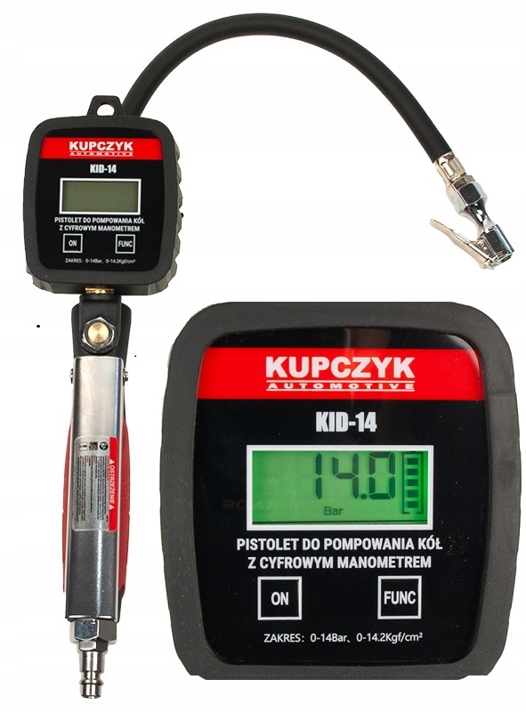 Профессиональный пистолет для накачки шин КИД-14 Купчик оснащен четким цифровым дисплеем. Он измеряет давление воздуха с точностью до 1%, отображая на дисплее точность измерения 0,14 бар. Цифровой манометр обеспечивает большую долговечность и удобство, чем аналоговая версия. Отображает четыре типа шкалы измерения в диапазоне от 0 до 14 Б бар (200 фунтов на квадратный дюйм, 1400 кПа или 14 кгс/см2). Он имеет эргономичную ручку и корпус манометра, что обеспечивает хороший обзор и простоту эксплуатации. Пистолет для накачки шин с цифровым дисплеем изготовлен из высококачественного материала в результате строгого производственного процесса, обеспечивающего длительную работу, герметичность и быстрое обслуживание. Устройство может использоваться на всех типах транспортных средств, оснащенных клапанами Шредера 8В1. Использовать можно для: грузовых автомобилей, внедорожников, легковых автомобилей, мотоциклов и велосипедов.