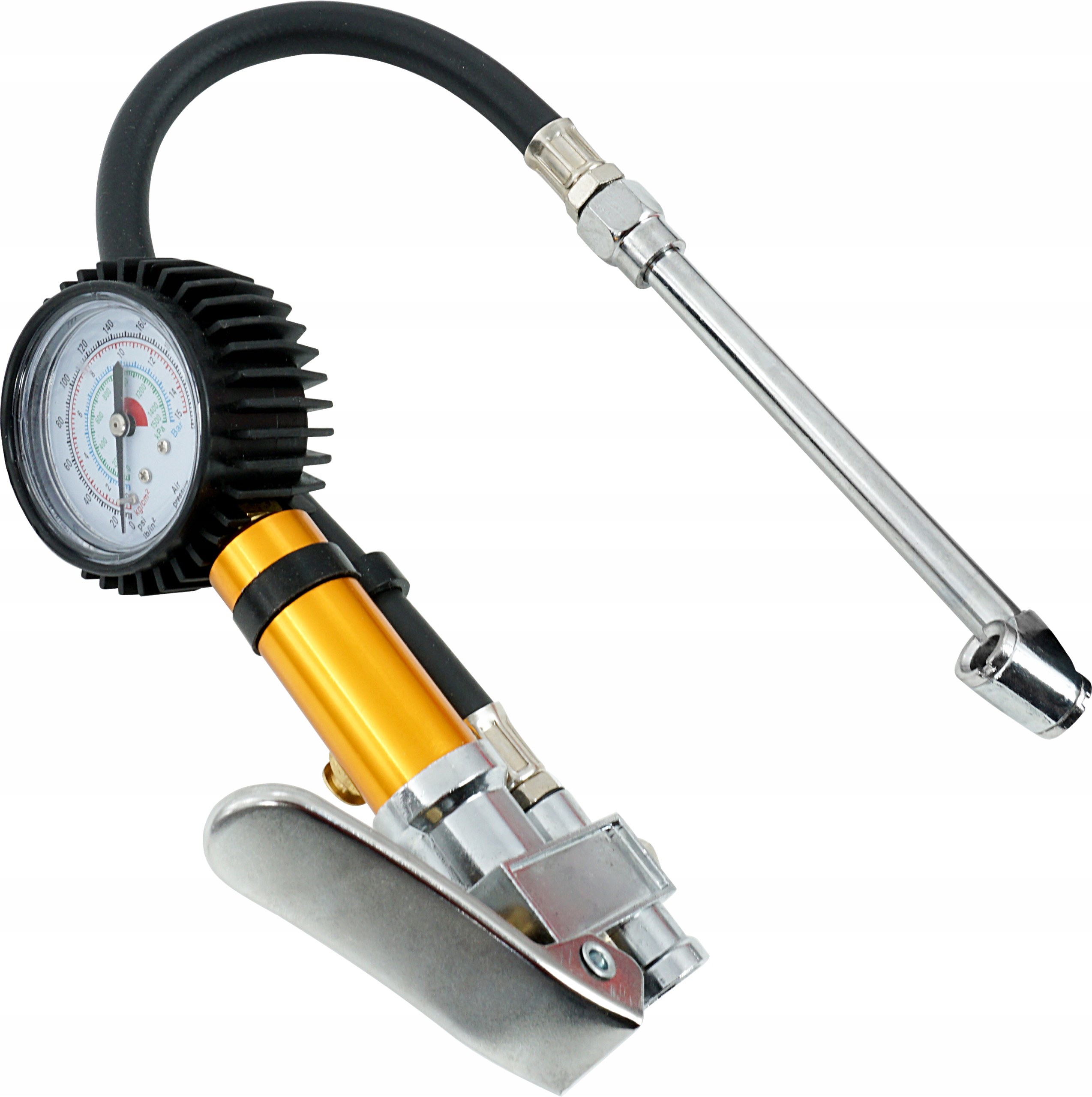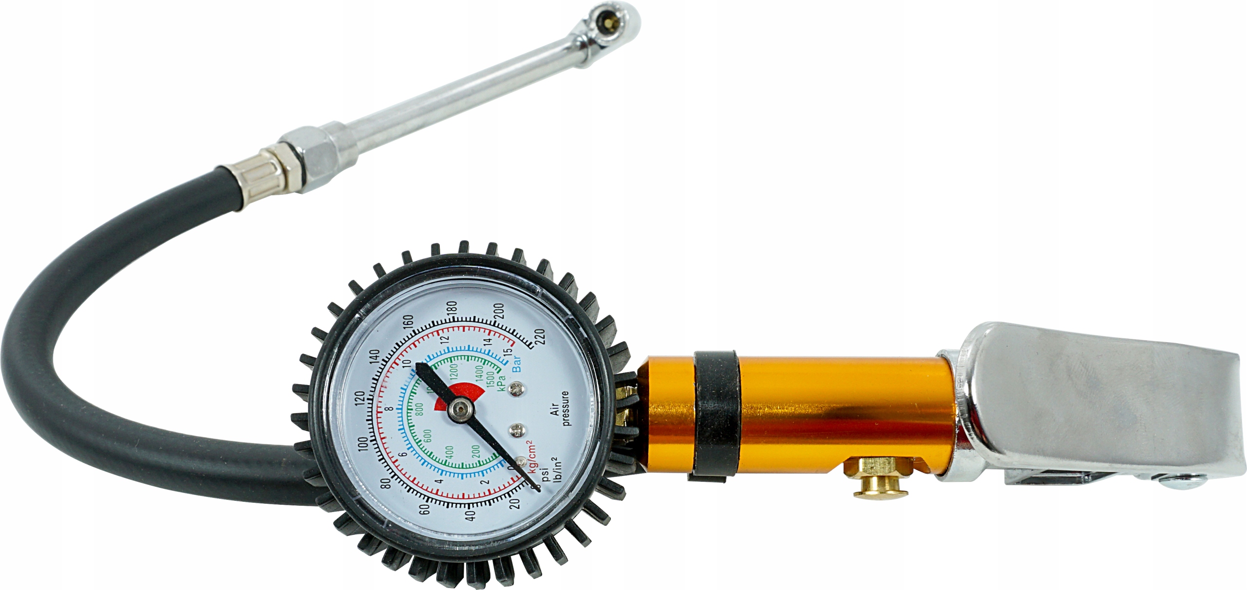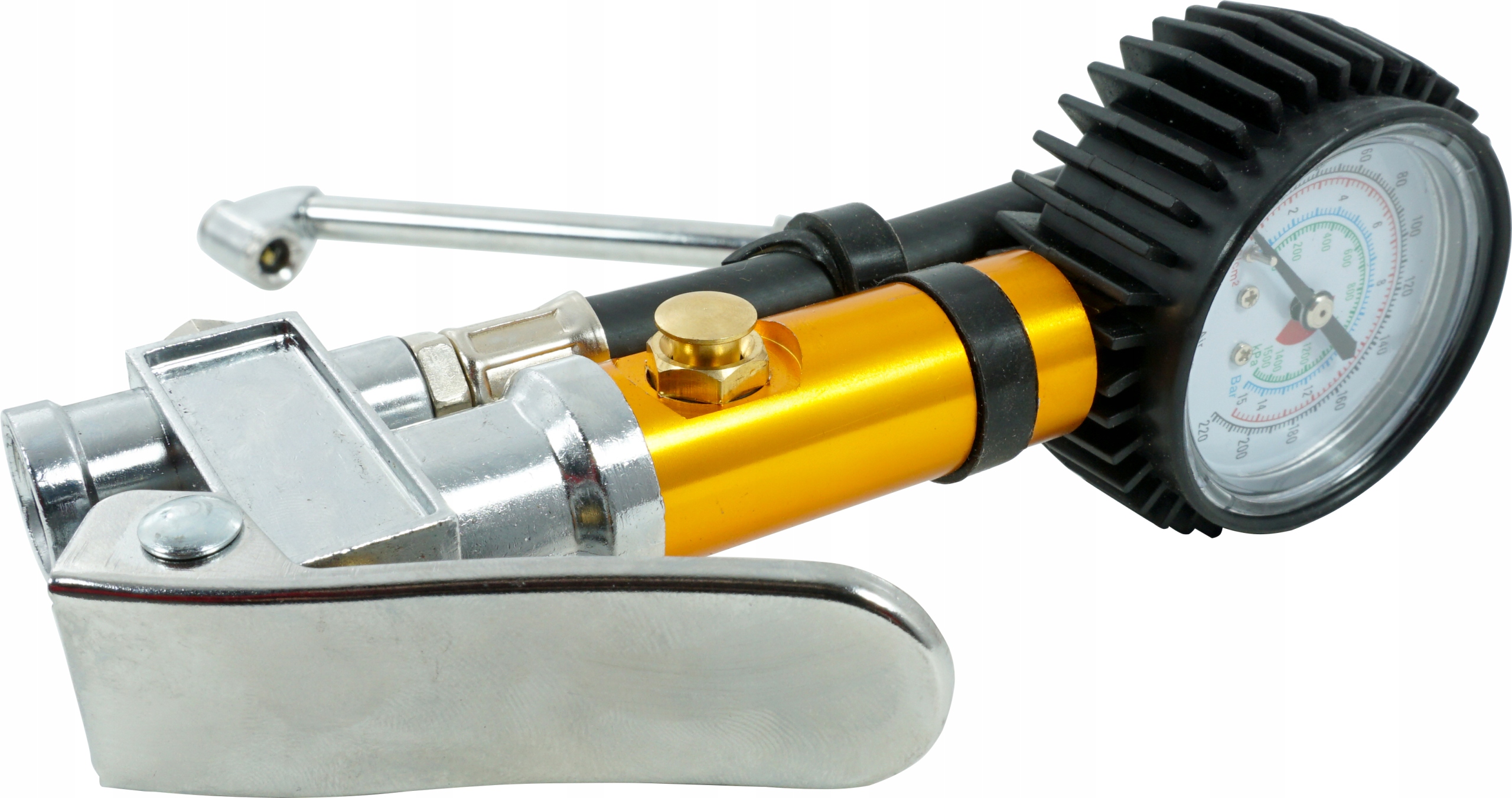 Накачивающий пистолет с манометром используется для накачивания и контроля давления в пневматических шинах. Корпус часов имеет резиновый корпус. Оснащен клапаном выпуска воздуха.