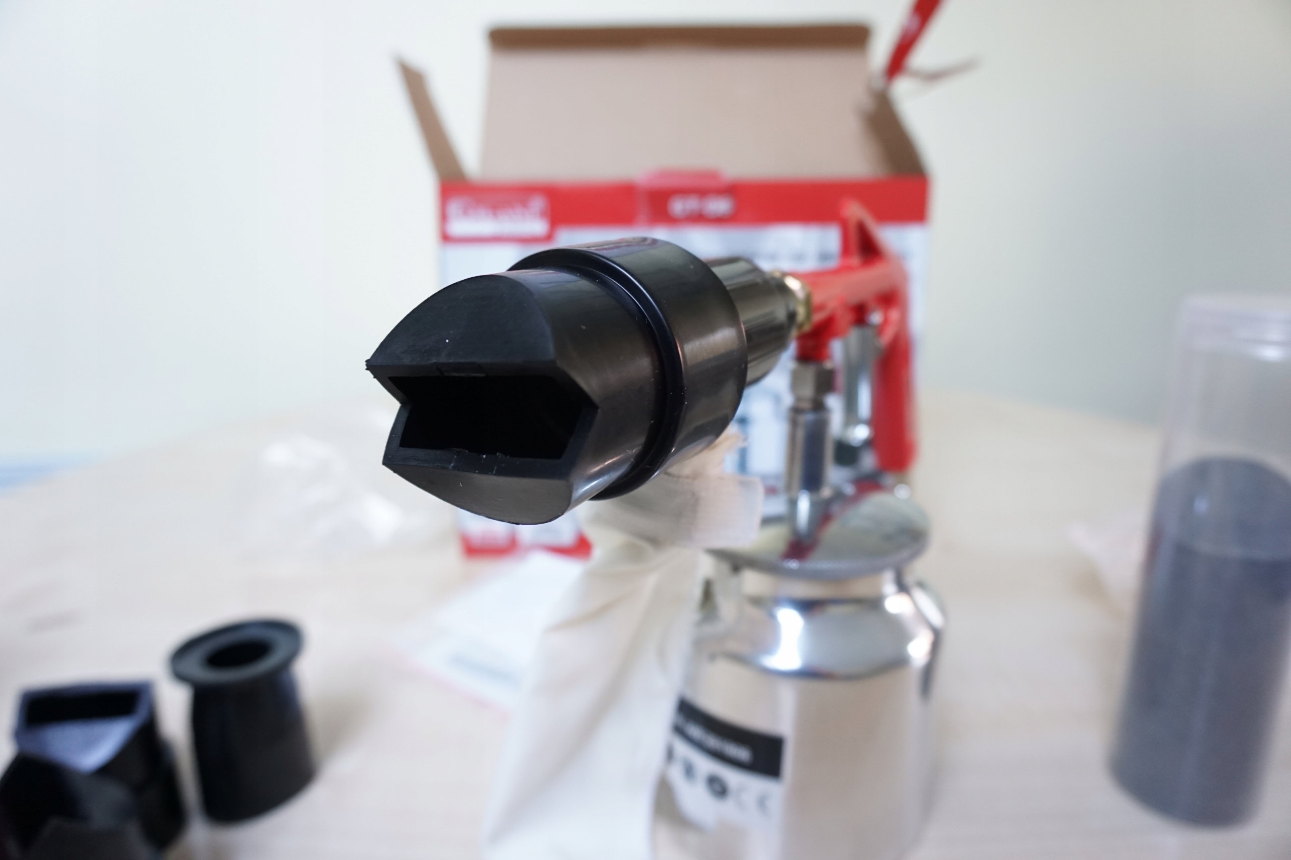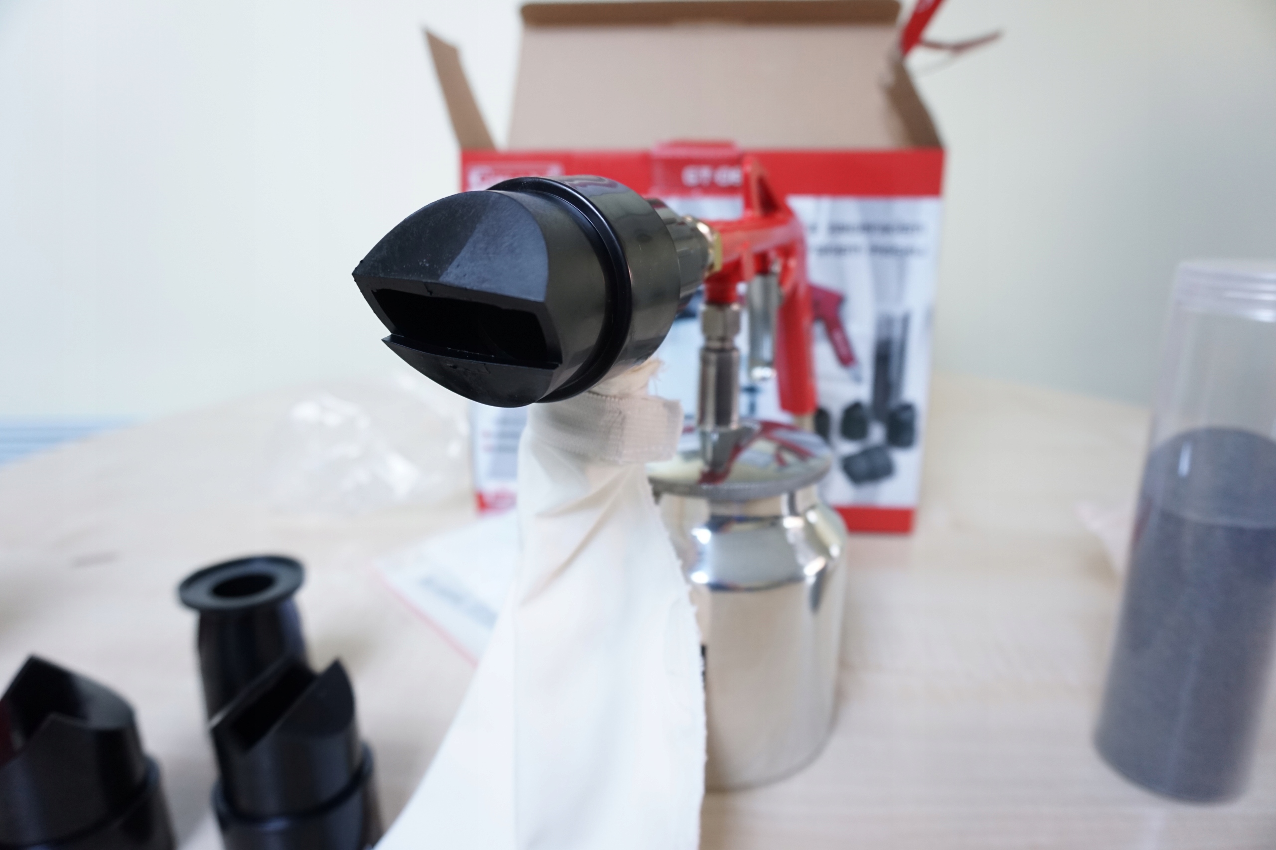 Пистолет имеет сменные резиновые насадки, позволяющие добиваться различных пескоструйных эффектов.