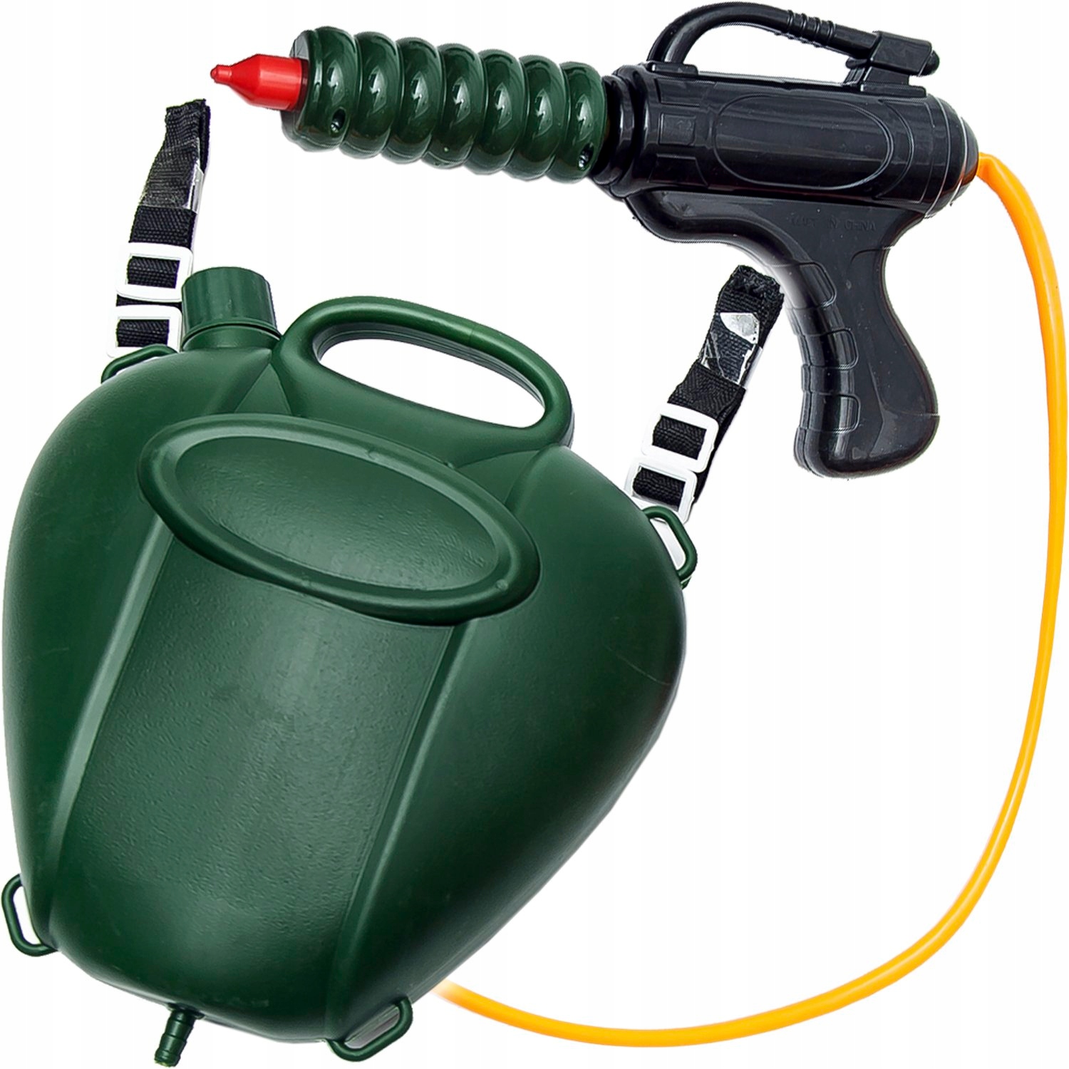 Набор включает в себя большой резервуар с ремнями, чтобы положить на спину, соединенный с пистолетом с пистолетом, чтобы водное развлечение не заканчивалось!