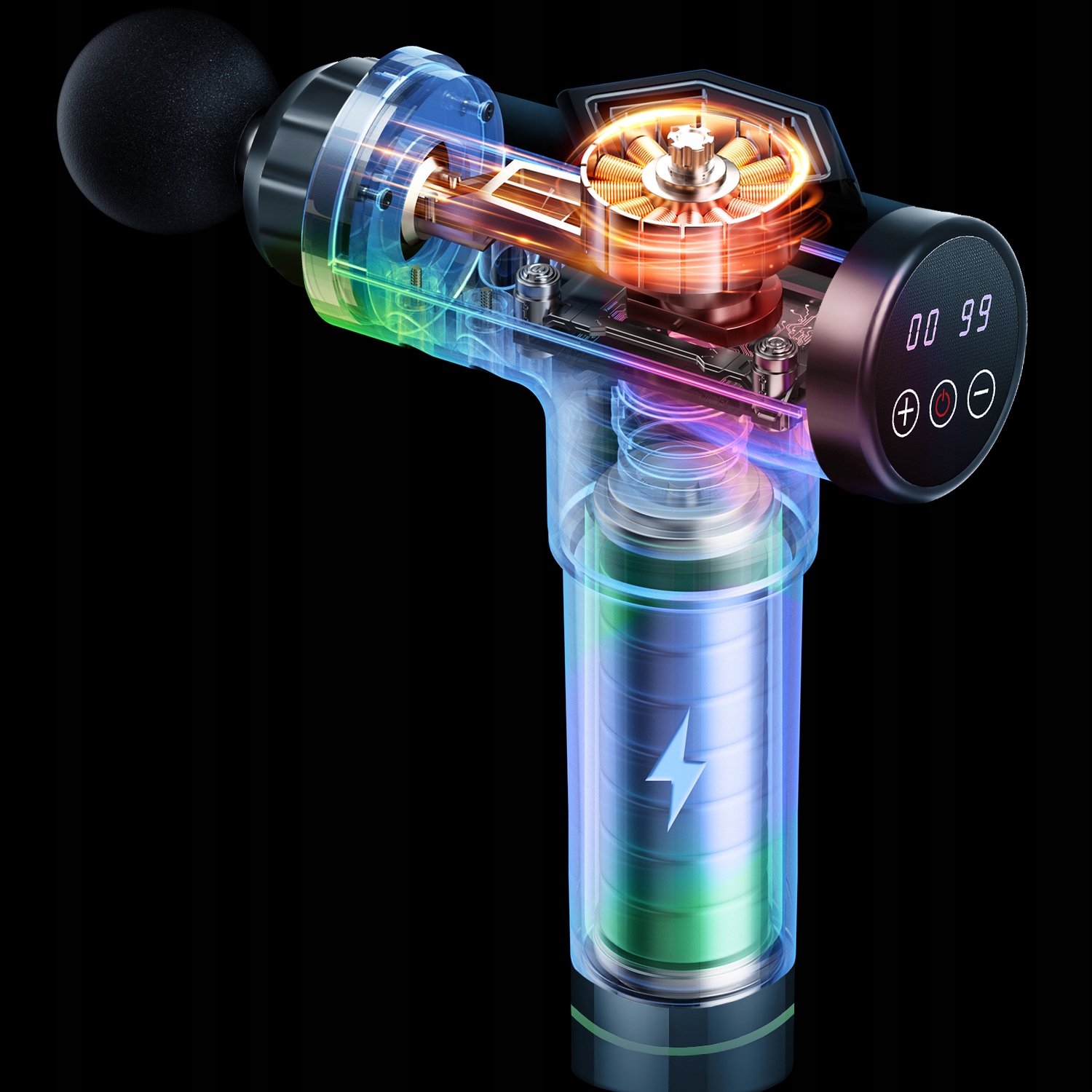 - Массажный пистолет для фасций глубиной 12 мм, 20 скоростей и 5 массажных головок, предназначенных для каждой группы мышц.