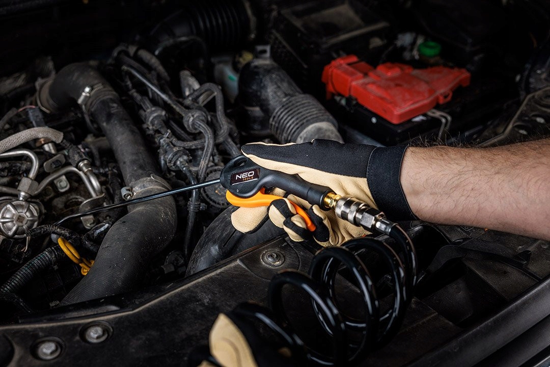Душевный пистолет 14-726 250 мм компании NEO Tools длиной 250 мм представляет собой инструмент, оснащенный узким наконечником, позволяющим продувать в труднодоступных местах. Пистолет изготовлен из PA66 + Стекловолокно + Metal Max, что обеспечивает долговечность и надежность на долгие годы использования. Он выдерживает давление 6 бар и имеет размер соединения ¼". Пистолет для обдува NEO Tools — проверенный инструмент для мастерских.