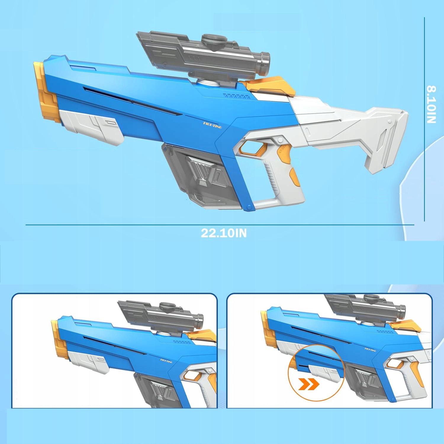 【Конструкция всасывающего спускового крючка】 Новый электрический водяной пистолет оснащен всасыванием воды: просто опустите всасывающее отверстие переднего пистолета в воду, а затем бросьте вперед, чтобы наполнить его, что позволяет стрелять. в бассейне.