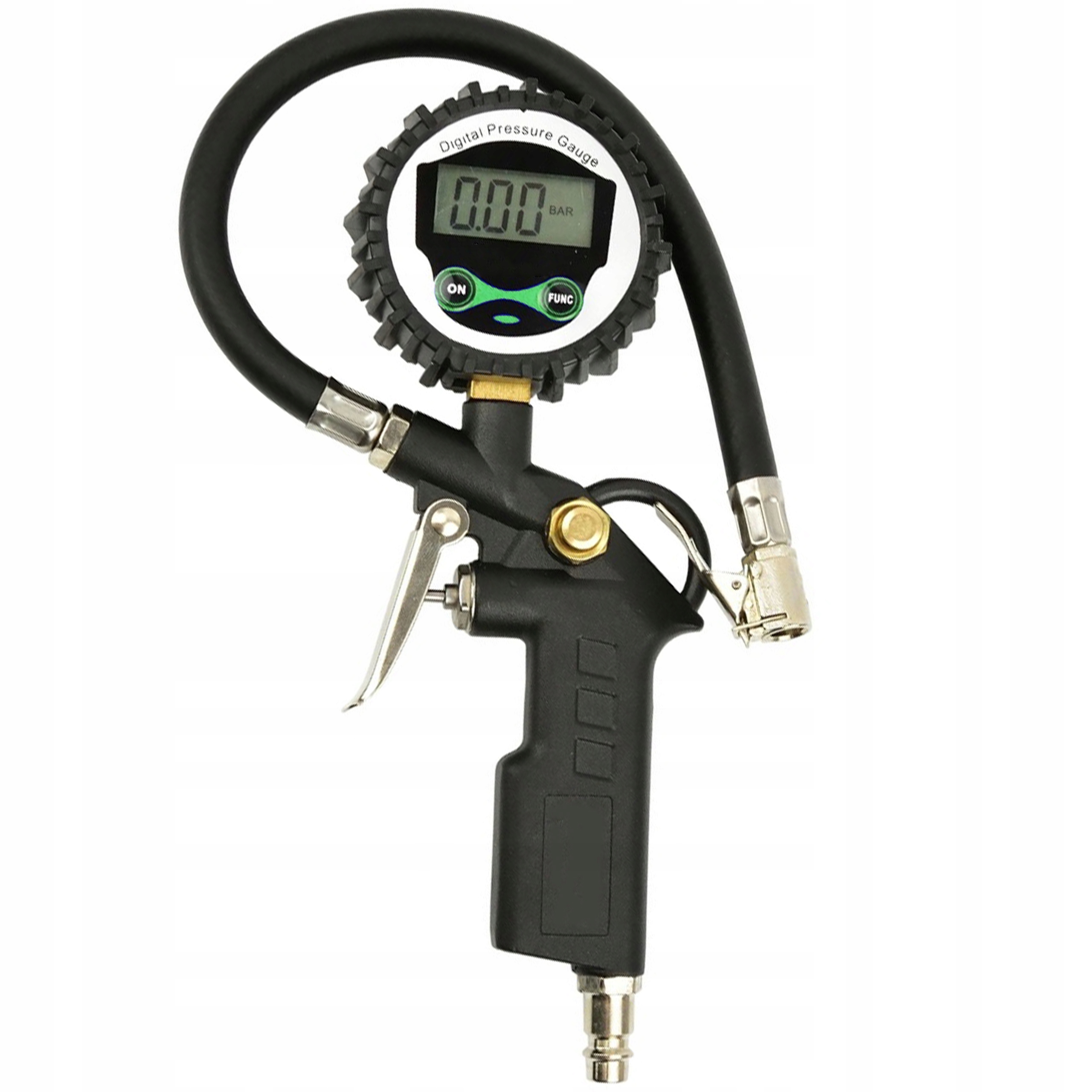 Накачивающий пистолет с электронным манометром, питание от двух батареек типа ААА, резиновая крышка манометра, клапан выпуска воздуха под большим пальцем, возможность установки единиц измерения: фунты на квадратный дюйм, бар, кг/см2, диапазон кПа 0-255 фунтов на квадратный дюйм. , стандартный быстроразъемный разъем