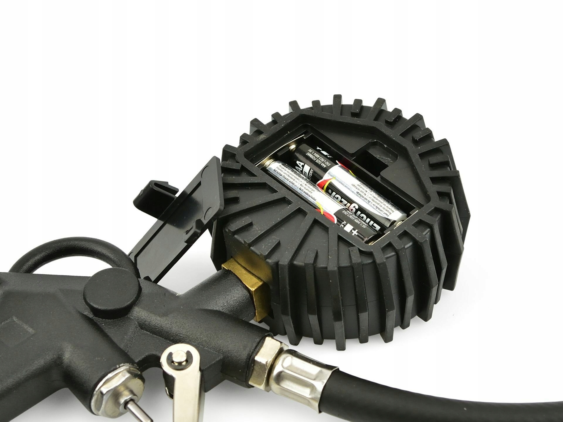 Высококачественный пистолет, используемый для накачивания колес со стандартными автомобильными клапанами. Манометр покрыт профилированной резиной, защищающей его от повреждений во время использования. Инструмент оснащен стандартным быстроразъемным разъемом, используемым в европейских пневматических инструментах. Цифровой манометр обеспечивает точные значения.