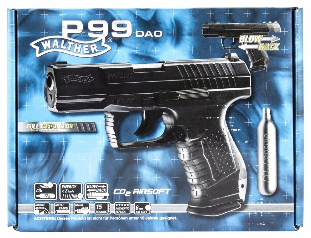 Walther P99 DAO - мощная копия страйкбола CO2, газовая система Blow-Back, металлический замок, магазин емкостью 15 шариков, 520 fps, сила 2J + 1000 шариков 0,12 г + ЗАЩИТНЫЕ СТЕКЛА + 10 CO2